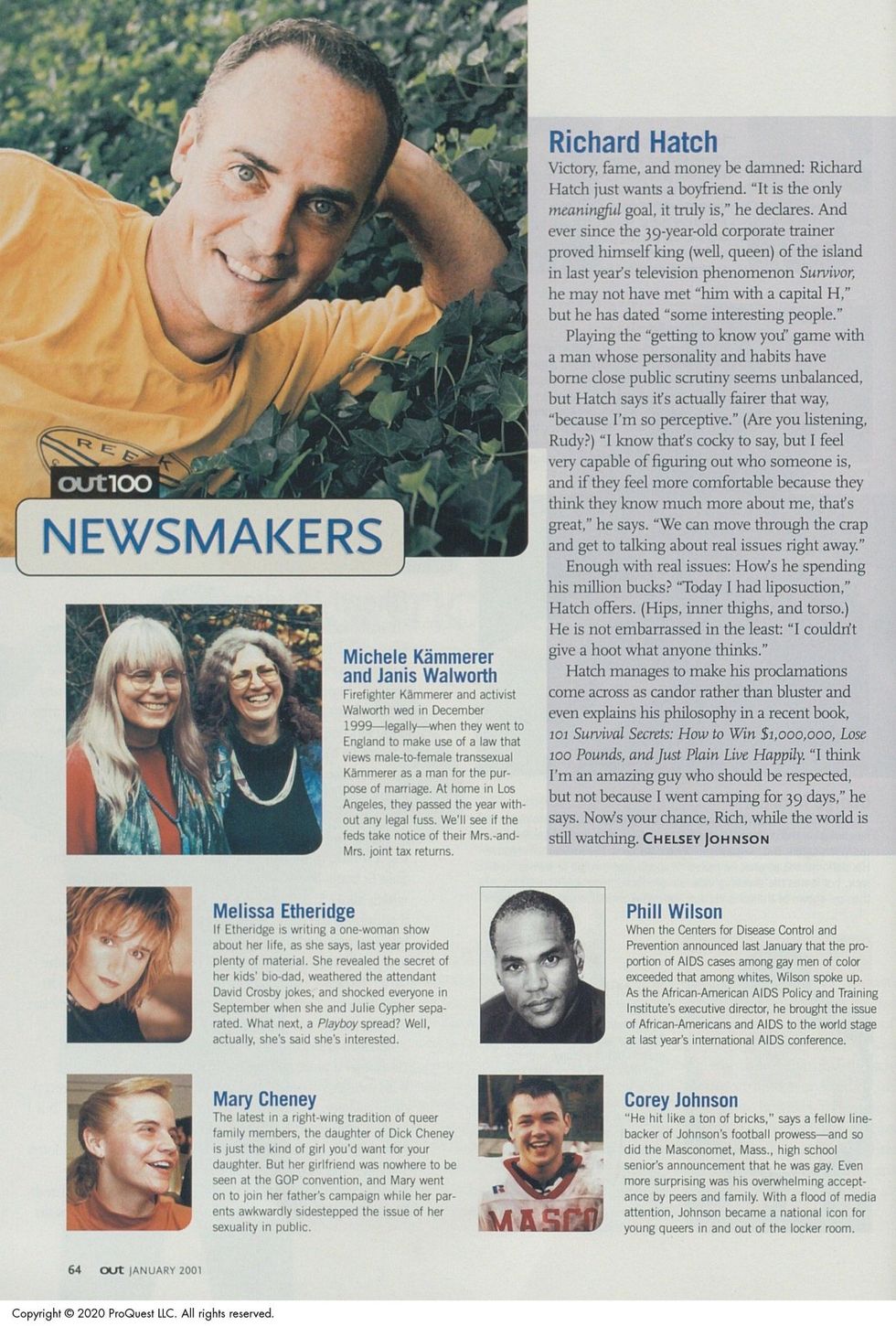 Author E. Lynn Harris was also celebrated on the Out100 that year, as his sixth novel, Not a Day Goes By, hit the bestsellers list. He was slated to make his screenwriting debut penning the remake of Sparkle, which would have been produced by Whitney Houston and starring Aaliyah. Needless to say, it never came to fruition. And Harris's own life came to a tragic and unexpected end just nine years later, though he managed to publish five additional fiction novels and a memoir in that time. Three more novels were published after his death, and in 2019, he became one of the first 50 LGBTQ+ trailblazers memorialized at the Stonewall Inn's National LGBTQ Wall of Honor.