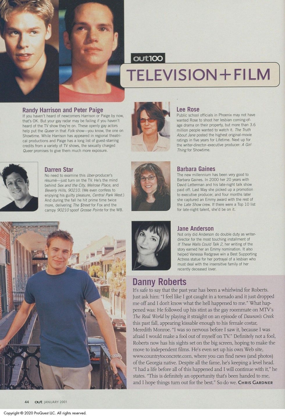 Speaking of Dawson's Creek... the Kevin Williamson-created series aired the first romantic kiss between two men (Jack and Ethan, played by Kerr Smith and Adam Kaufman, respectively) in a primetime network drama in May of 2000. Greg Berlanti had taken over as showrunner, and was profiled in Out alongside fellow WB scribe Ryan Murphy and director Jamie Babbit — all of whom would go on to have a serious impact on bringing queer stories to TV.