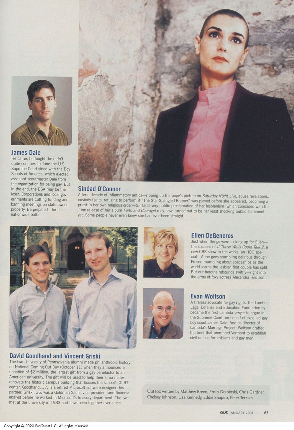 One more Out honoree of note from 2000 was Sinéad O'Connor. Eight years after she rocked the boat by tearing up a picture of the pope on Saturday Night Live, O'Connor came out as a lesbian during an interview for Curve. She would walk it back several years later, telling Entertainment Weekly that she was "three-quarters heterosexual, a quarter gay," and identifying as both asexual and someone who doesn't use labels at all at different points in her life. Although her career never fully recovered from SNL, O'Connor remained a fiercely admired musician and activist up until her death in 2023.