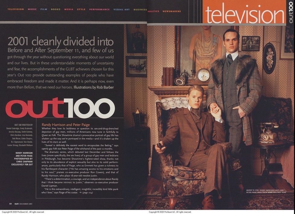 Television may have played a role in those shifting attitudes. Queer As Folk premiered at the tail end of 2000, and the first season proved to be a ratings hit for Showtime over the first half of 2001. Stars Randy Harrison and Peter Paige were among those featured on the Out100 list that year. Both stayed with the show through all five influential seasons, and Paige later went on to co-create another queer favorite, The Fosters.