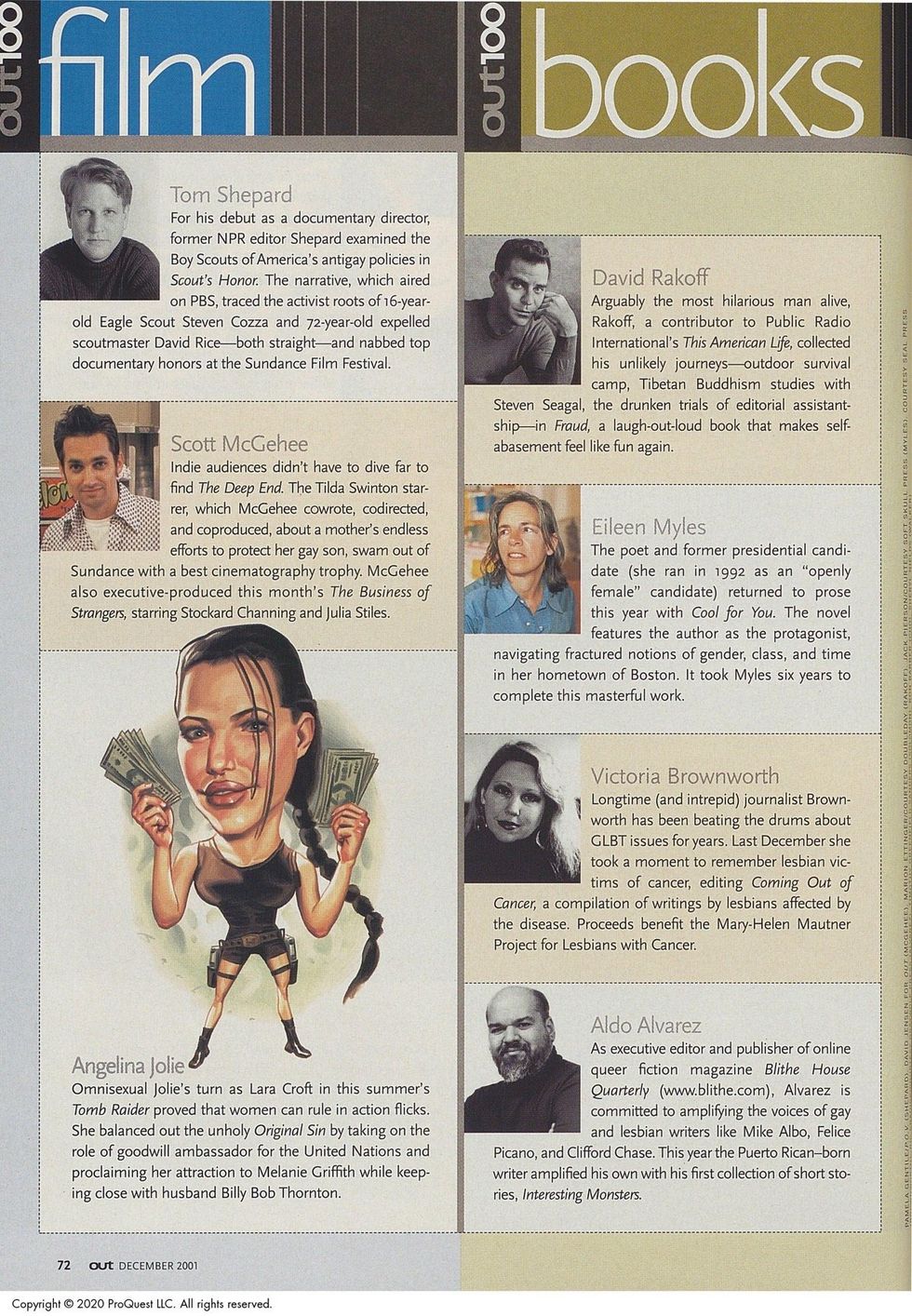 Of course, 2001 is most remembered by Americans for the 9/11 terrorist attacks that killed nearly 3,000 people. New York firefighter Tom Ryan was among those recognized on the Out100 as the year came to a close, and in 2023, Out paid tribute to two gay men who died heroically saving others that day — Mark Bingham, a passenger on Flight 93, and Father Mychal Judge, who ran into the North Tower after it was struck to help.