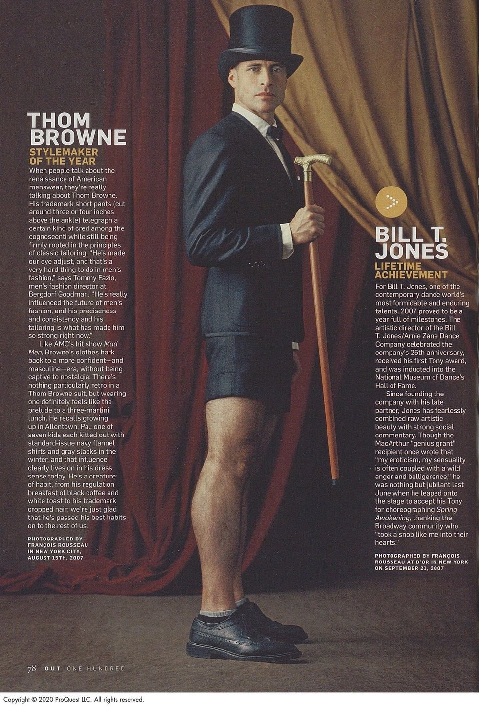 The final Out cover star from 2007 was Thom Browne, a designer who was already challenging traditional gender norms in fashion by the mid-aughts. In fact, David Bowie himself wore one of Browne's suits during a televised performance at Radio City Music Hall in 2005, just after the designer's first ever menswear runway show in New York City.