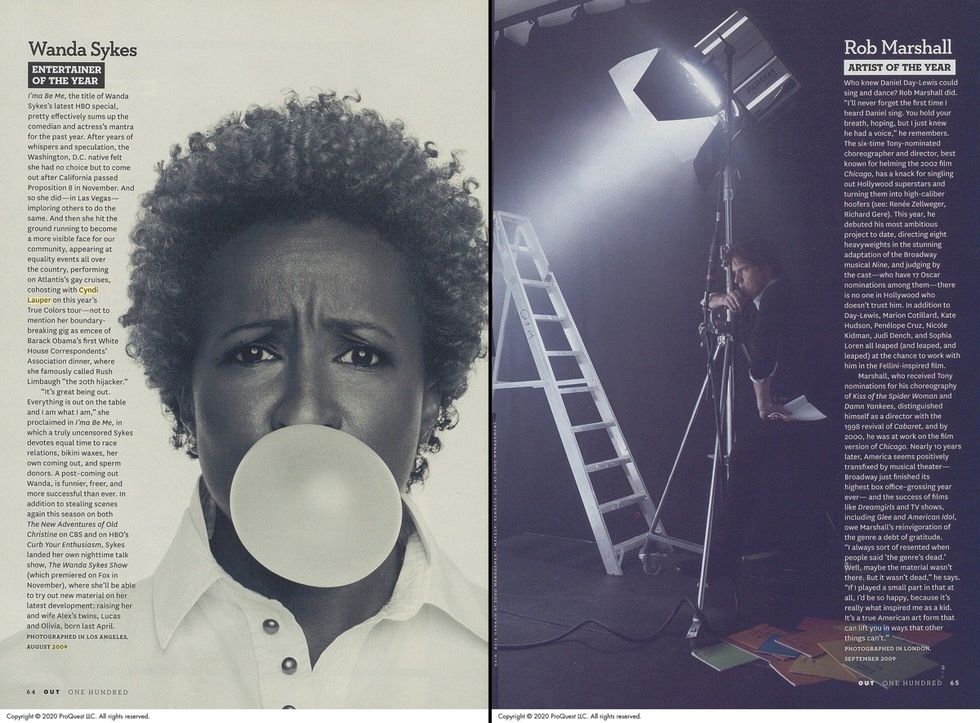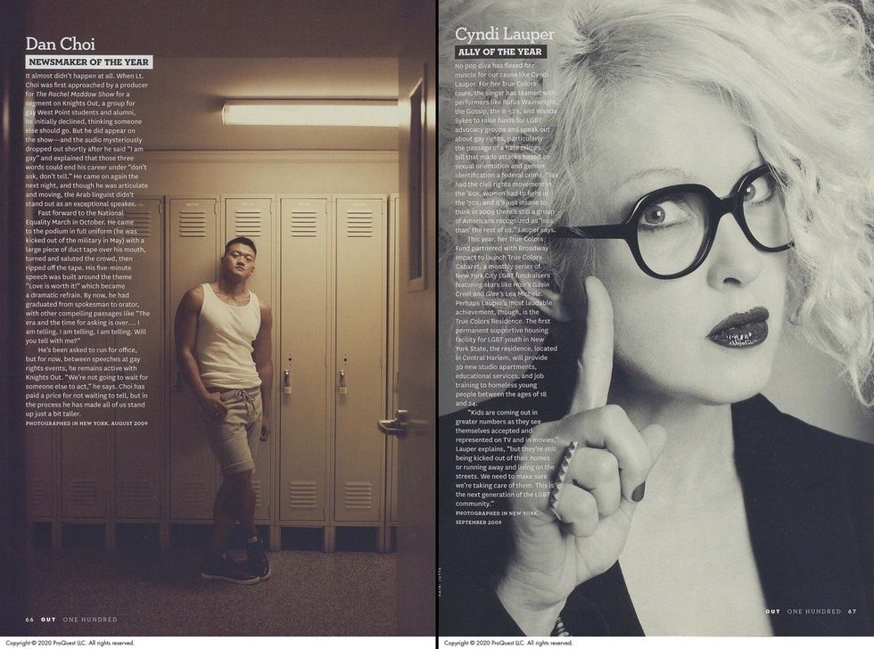 Adam Lambert, Wanda Sykes, Dan Choi, Rob Marshall, and Cyndi Lauper were the five stars who graced the cover of the 2009 Out100 list.