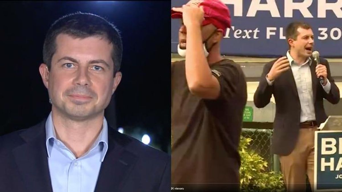 It's been a wild month for Buttigieg. As he noted in a speech in St. Petersburg, Florida Wednesday night the Biden-Harris ticket has asked a lot of him to help the campaign. They asked him to play Mike Pence opposite Kamala Harris in debate prep. Then, time and time again, they served him up to Fox News where he developed a reputation of leaving interviewers stumped. Now they have him flying across the country whipping up support. And on Wednesday night's event in Florida, he was doing just that in hopes to mobilize the LGBTQ+ community when a heckler interrupted Buttigieg's remarks wearing cargo shorts and a MAGA hat, seemingly livestreaming.