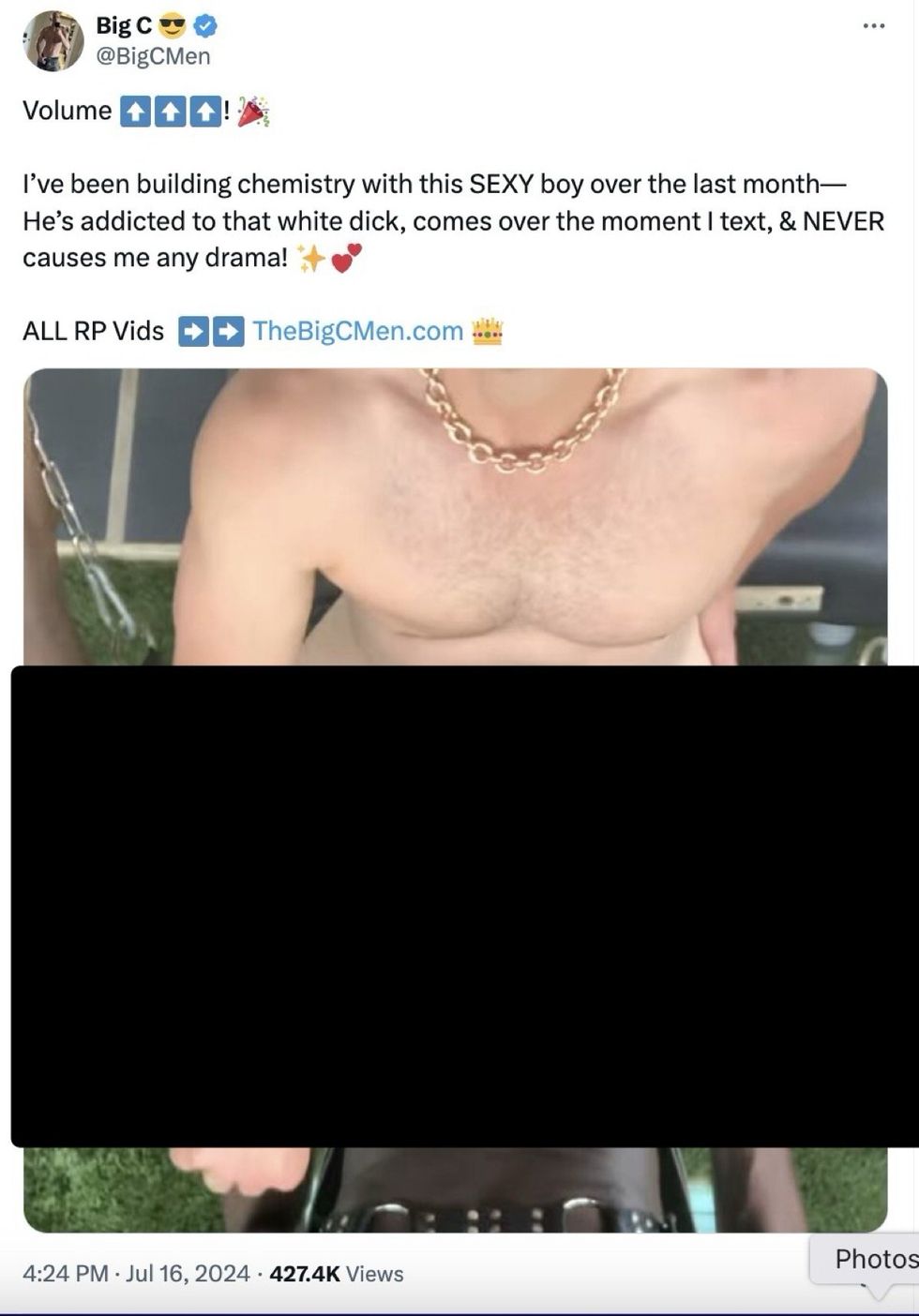 While the aforementioned X video was associated with the election results, this wasn't the first time that Big C posted a video having sex with a Black man and repeatedly calling him an n word.