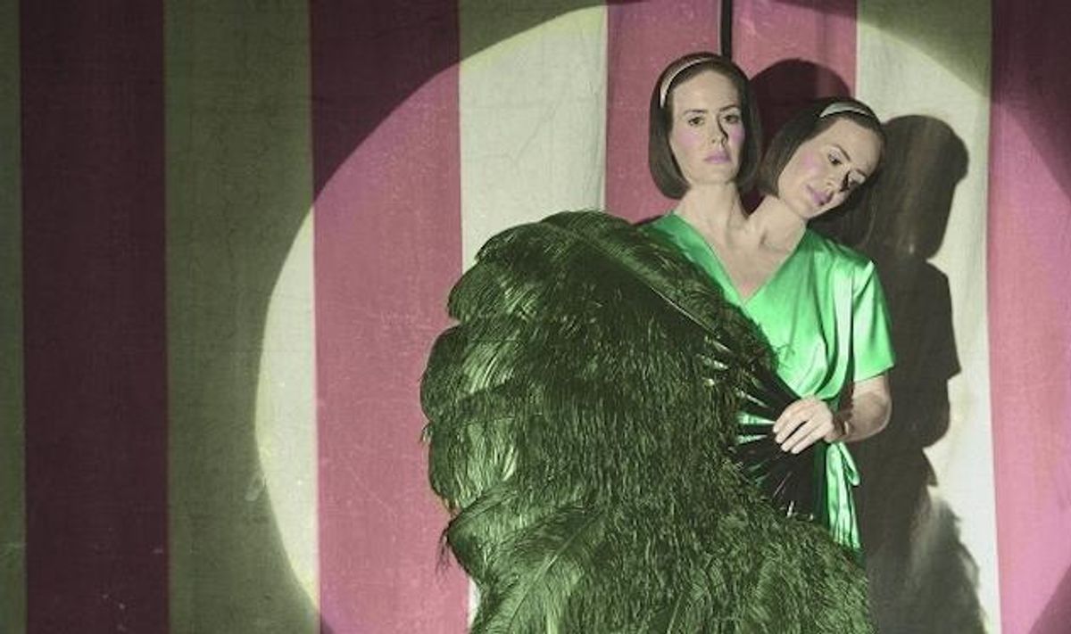 "I was so excited." Her third role on the show, Paulson has previously played lesbian investigative journalist Lana Winters in Asylum and Supreme Witch Cordelia Foxx in Coven. "My character in Coven wasn't as much fun as playing Lana." She's hopeful for this new season, as the show's setting is, as she describes, "more in line with my personal tastes... It's about the idea of feeling totally cast aside... Me, I feel that way every day. I feel that way right now! I mean, I'm joking, but only sort of. I've never been one of those people who has a very healthy sense of themselves. I suffer from the sense that everything good in my life is about to go away."