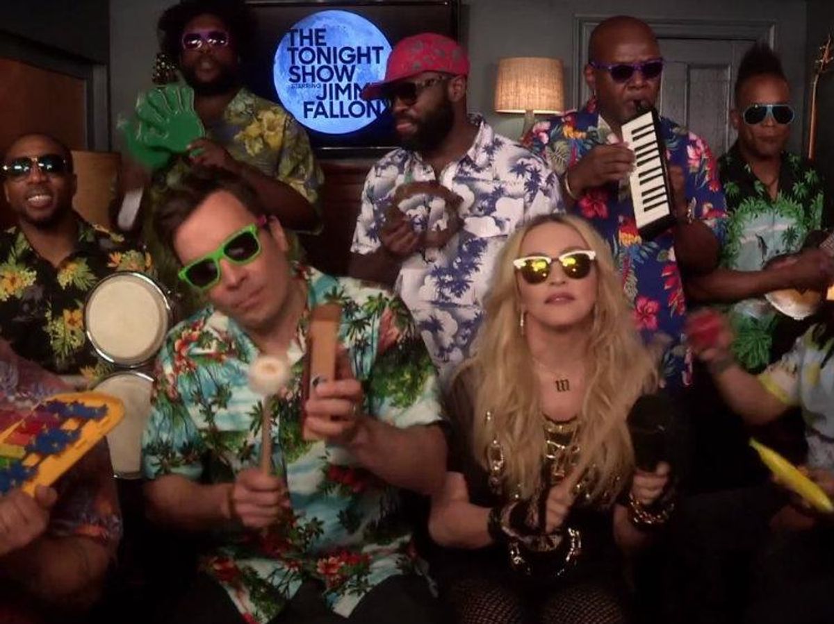 In the ways of just about every other contemporary pop artist who appears on Jimmy Fallon's show, Madonna sat down with the Tonight Show host and The Roots to sing one of her classics - "Holiday." She was accompanied by a harmonica, woodblock, some plastic clappy hands, and just about any other instrument you could find digging through the box in the corner of an elementary school music classroom. The result was obviously amazing because, well, it's Madonna.