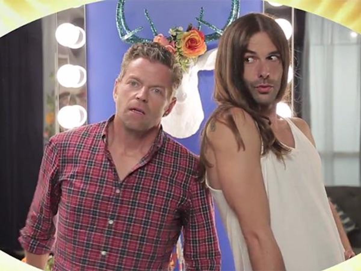The fifth season of Game of Thrones is finally here, which means that comedian Jonathan Van Ness' salon chair will once again be packed with guests hungry for his recaps. Funny or Die's Gay of Thrones returned with former TRL host Dave Holmes, and it was everything we could have hoped for: fortune teller Amy Winehouse, Top Gun volleyball fantasies, Doctor Evil, Fred Willard, Elisabeth Shue, and Vin Diesel. Filled with "vague references, confusing plot analyses, and kind of spoilers," this hilarious gay parody will get you ready for the season of twists, deaths, and gay sex ahead, such as: