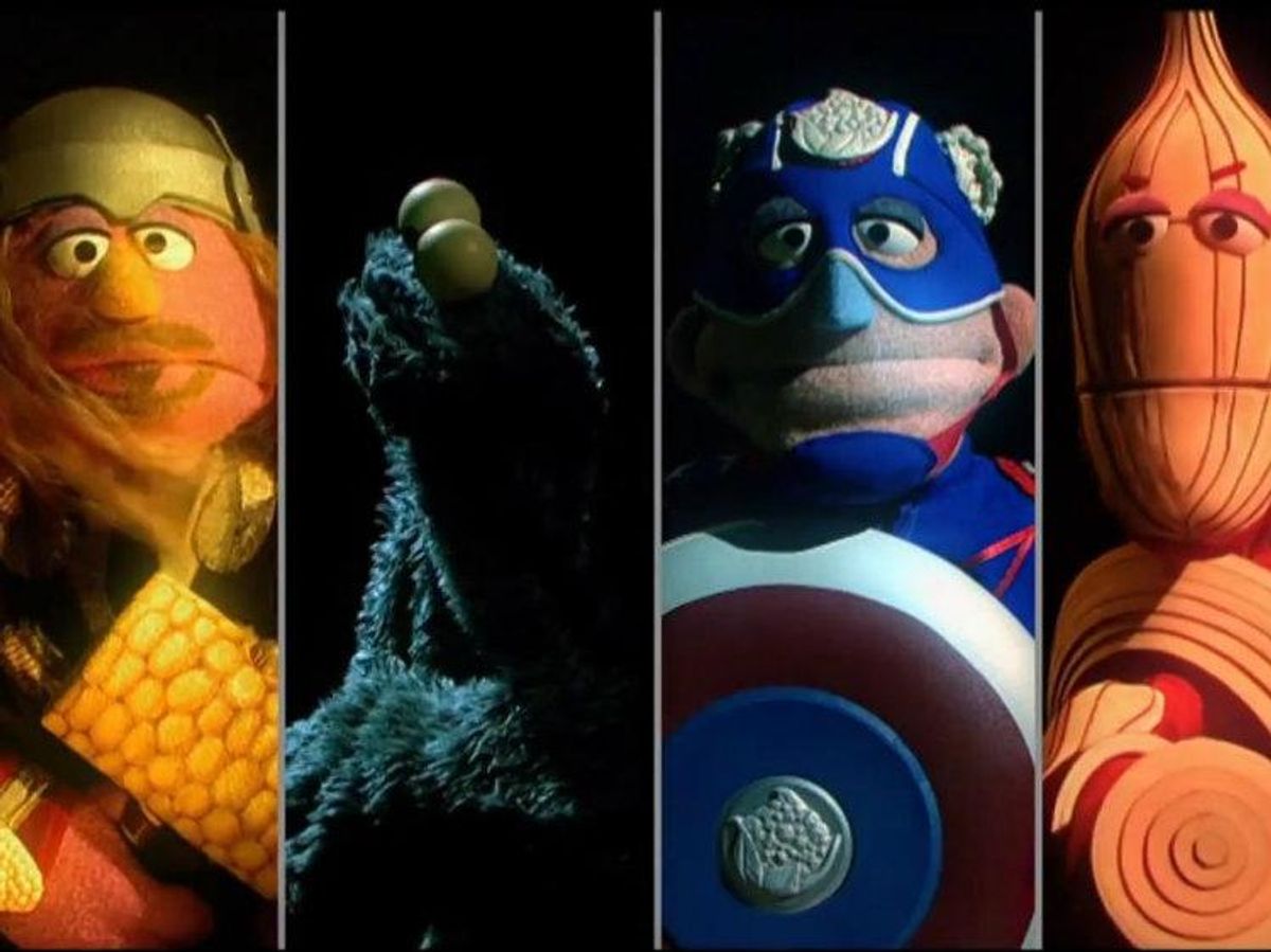 In The Aveggies: Age of Bon Bon, brought to you by the letter F for "Focus," a team of superheroes must work together to stop Bon Bon from "desserting" all of the world's healthy snack. To do that, Onion-Man, Captain Americauliflower, The Mighty Corn, Black Bean Widow, and Zuchin-I must rely on the always-hungry Dr. Brownie, who is obviously played by Cookie Monster, to focus long enough to save the world.