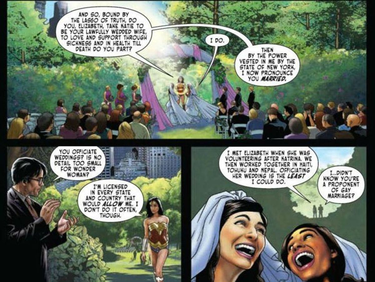 News outlets are calling this Wonder Woman's first same-sex wedding. But as she points out to Clark Kent in the comic, on Themyscura, the all-female island she comes from, a same-sex wedding is just a wedding. Now the only question is how long it'll take before a real-life geek couple works "bound by the lasso of truth" into their wedding vows.