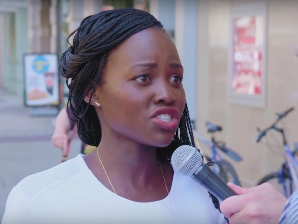 "You look like the type of guy who will go into a petting zoo at 2twoin the morning," Nyong'o says to one passerby, quoting Bob Saget. "Never f*ck a goat. I don't know you, but I'm telling you, never f*ck a goat."