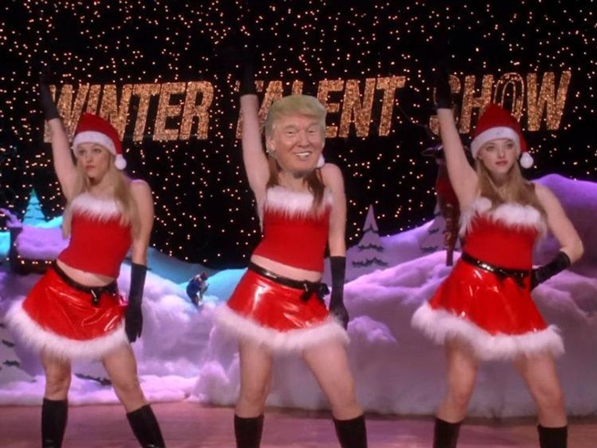 It turns out that even drama-hungry high school girls don't want anything to do with him. After a test-run at the Plastics' table and admitting that he has a crush on President Obama, Trump, like Regina George, gets his comeuppance. The only difference is that after Regina got hit by a bus she changed, and it's painfully obvious that Trump is too stubbornly stuck in the mindset of a popular high school girl to grow as a person.