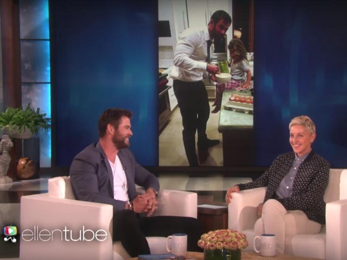 Certified hot piece Chris Hemsworth stopped by Ellen to promote his latest film, The Huntsman: Winter's War. After he finished telling Ellen about how he wanted his daughter to see the film because of the strong female characters, thus flooding the basements of the entire studio audience, Daddy Hemwsorth proved he's a modern father in every sense.