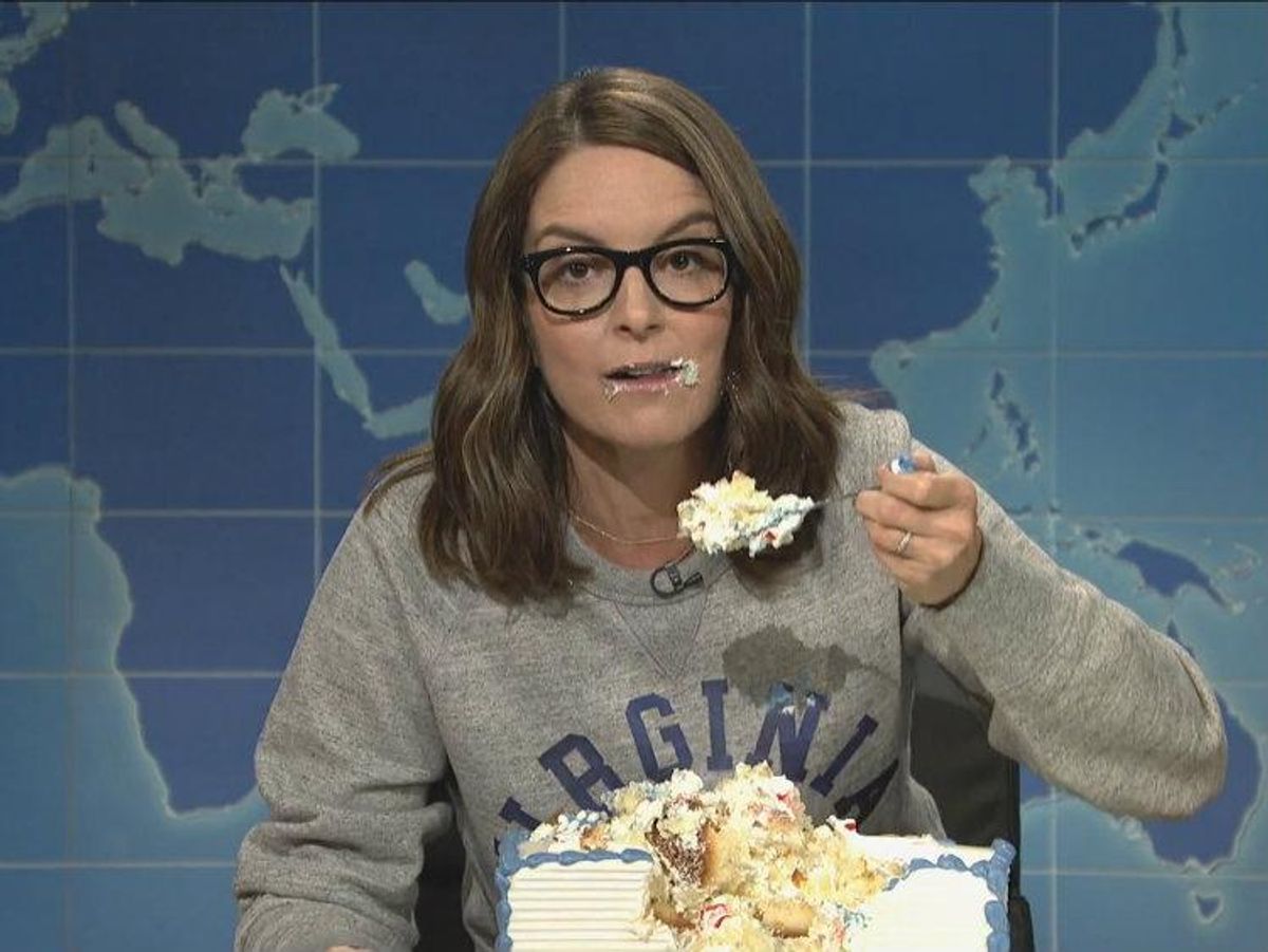Of course, it's hard to stay on topic when discussing some of our country's most recent events without a conduit for your overflowing stress and rage. Enter Fey's "sheet-caking" method of devouring an entire cake while talking about some of the most divisive subjects.