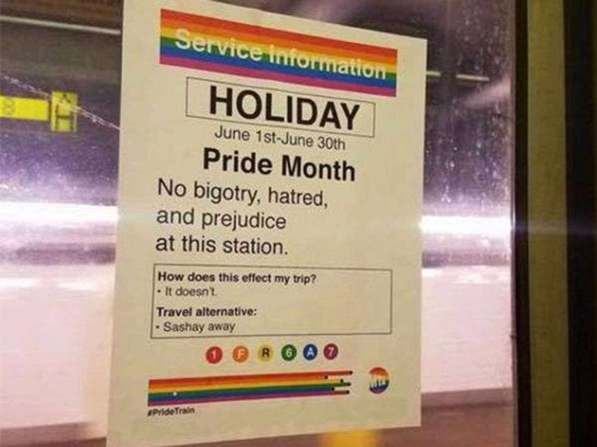 New Yorkers have to deal with subway notices all the time, but they're usually more frustrating then helpful. This week as May turned to June, Pride Train papered the MTA with some especially colorful Service Information posters, making riders aware that June was Pride month. Where it would usually say what subway lines would not be running the notices instead inform MTA riders that there is "no bigotry, hatred and prejudice at this station."