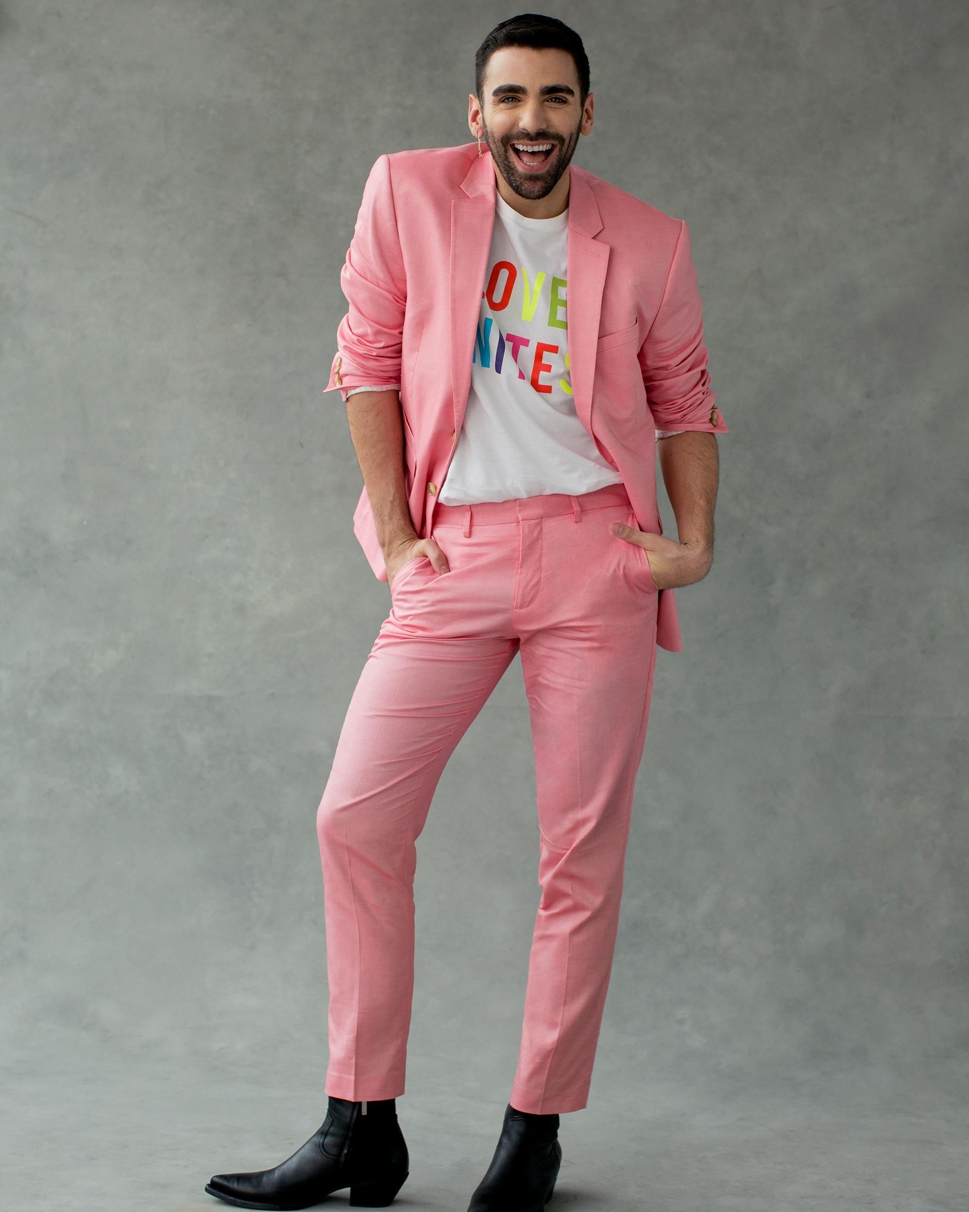Above, Phillip is pictured in the Express Stretch Suit Jacket, Express Stretch Suit Pants, and Express Love Unites Graphic Tee.