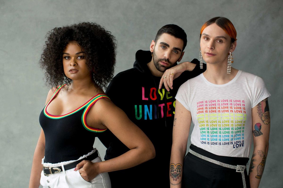 Above, Raquel (left) in the PRIDE BLZR, Phillip (Center) in the Express Fleece Hoodie and Express Sash Tie Pant, and Coco (Right) in the Express Love Unites Graphic Tee, Express High Waisted Culottes, and Express Crystal Gem Belt.