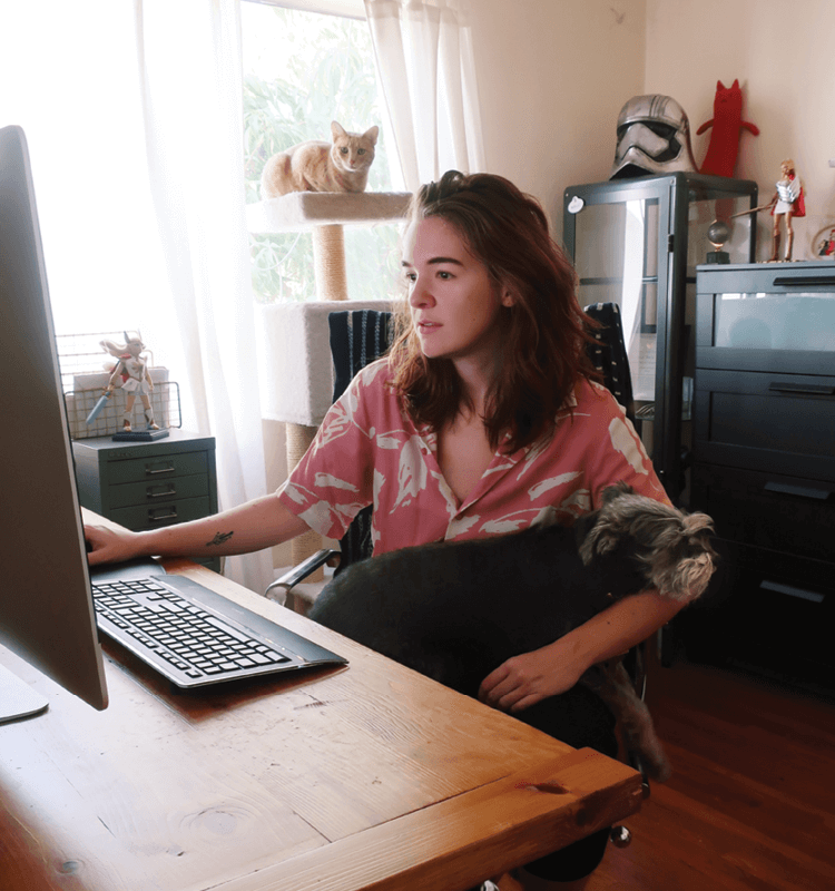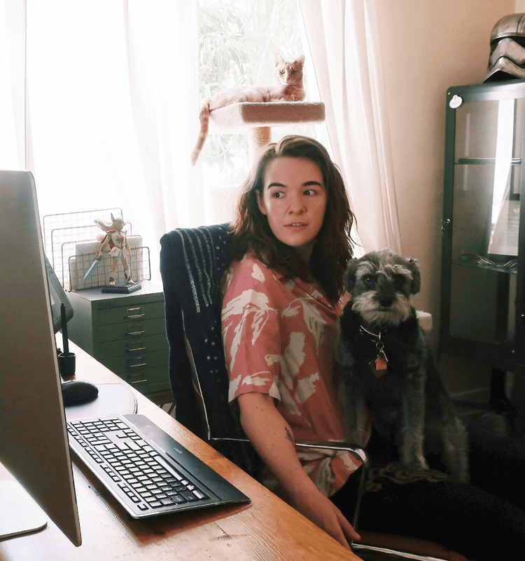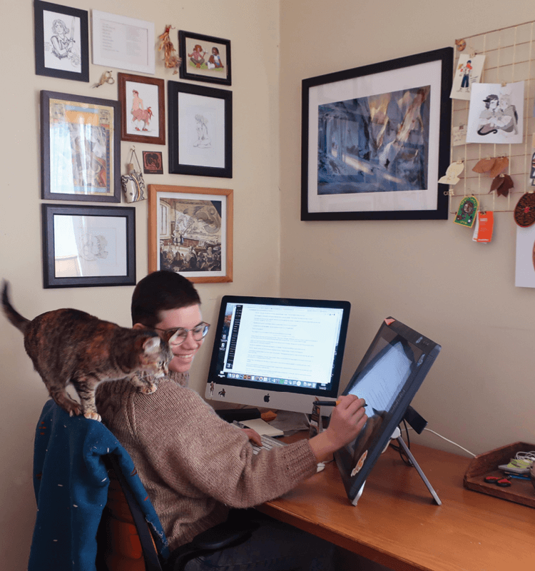 Molly Knox Ostertag (top) and ND Stevenson hard at work with their adorable pets: a dog named Winston and two cats, Fig and Toast.