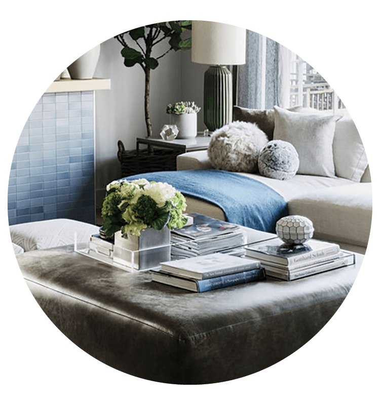 Centralize your coffee table or ottoman with a tray, especially if you like to entertain or gather around this sitting area with your loved ones. Feet up? No problem. Need more room? Simply remove the tray temporarily. Casual but stylish, and don't forget to add your favorite fragranced candle (flowers too, of course). They always add to the mood. Don't overthink it; simply drop and stack your favorite gorgeous books and adjust according to your guests' interests.