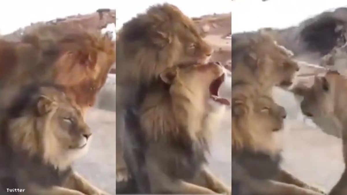 Though the video is relatively short, there's certainly a lot going on. It begins with a lion mounting what seems to be another male lion. Their manes intertwine and they even nuzzle a little for a second. The cat on the bottom yawns, nothing to see here.