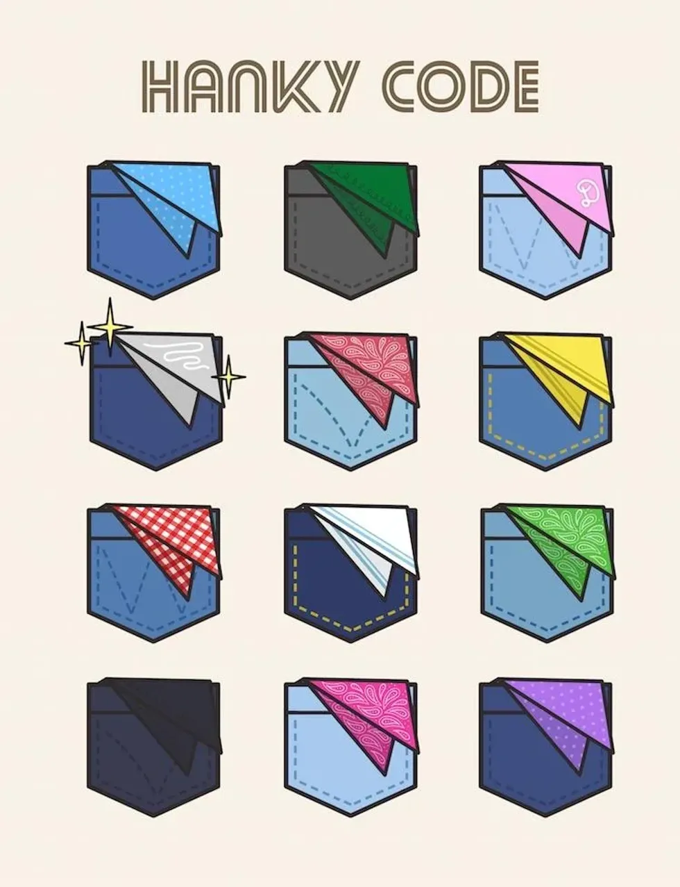 Scroll through Simmonds' illustrations to learn more about the many hanky meanings and find the hanky that best reflects your sexual interest and desires!