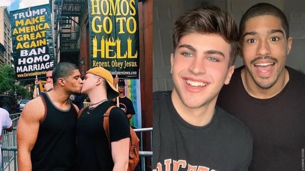 When professional wrestler Anthony Bowens and his boyfriend, YouTube star Michael Pavano, came across a homophobic group of protesters recently, they decided to kiss the hate away in a very public lip-lock right on the spot. And while the anti-LGBTQ+ protestors stood aghast as Bowens and Pavano kissed proudly and unafraid, the lovely pair received a tsunami of support for their brave act in the face of bigotry when they posted a pic of the event to social media.