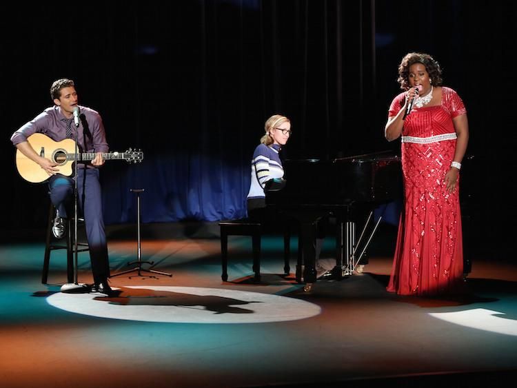 Alex Newell (right) performs in the "Transitioning" episode of Glee airing Feb. 13