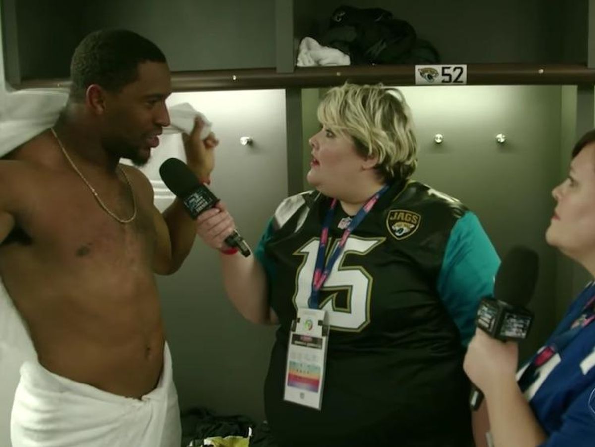 The other Corden girls took the show into the skin-heavy locker rooms of the Colts and Jaguars to interview some of the hunky, towel-clad players--and they weren't afraid to practice their ball-catching on the green carpet.