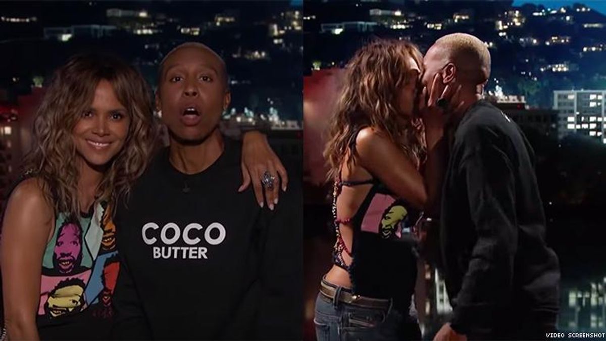 After a bit about hosting a lesbian gala in Miami where she was offered cocaine after joking that she was too pregnant to drink, Waithe admitted that she was nervous and needed some words of encouragement. Kimmel's security guard Guillermo advised her to push the "Berry Button," which summoned none other than Oscar-winner Halle Berry to the studio to give Waithe a pep talk.
