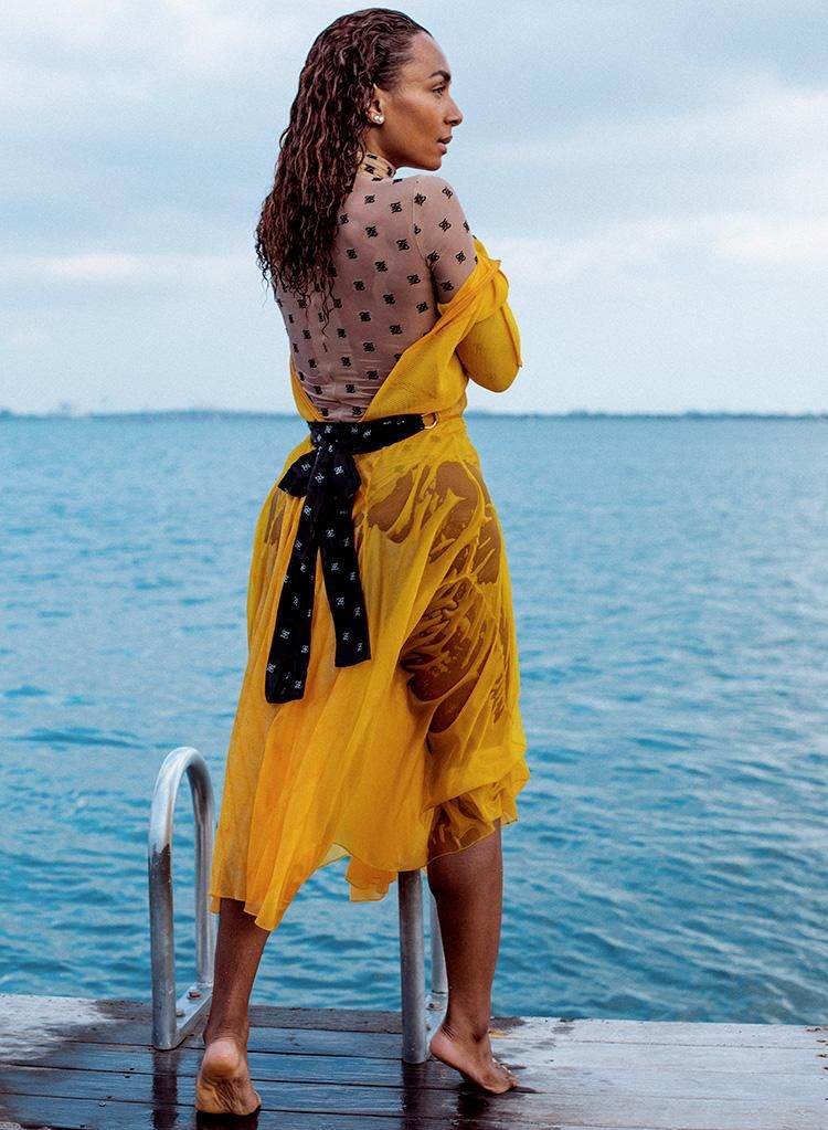 Skirt and cape by Prada. Bra by Fleur du Mal. Shoes by Givenchy. Earring by Louis Vuitton.