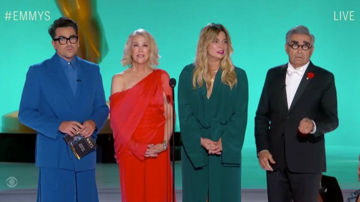 The cast of the critically-acclaimed and Emmy-winning comedy series Schitt's Creek -- Dan Levy, Eugene Levy, Annie Murphy, and Catherine O'Hara -- delivered arguably the best bit of the night while presenting the awards for Outstanding Comedy Writing and Outstanding Comedy Directing, reminding everyone in attendance (and the rest of the world, for that matter) why we love them so much!