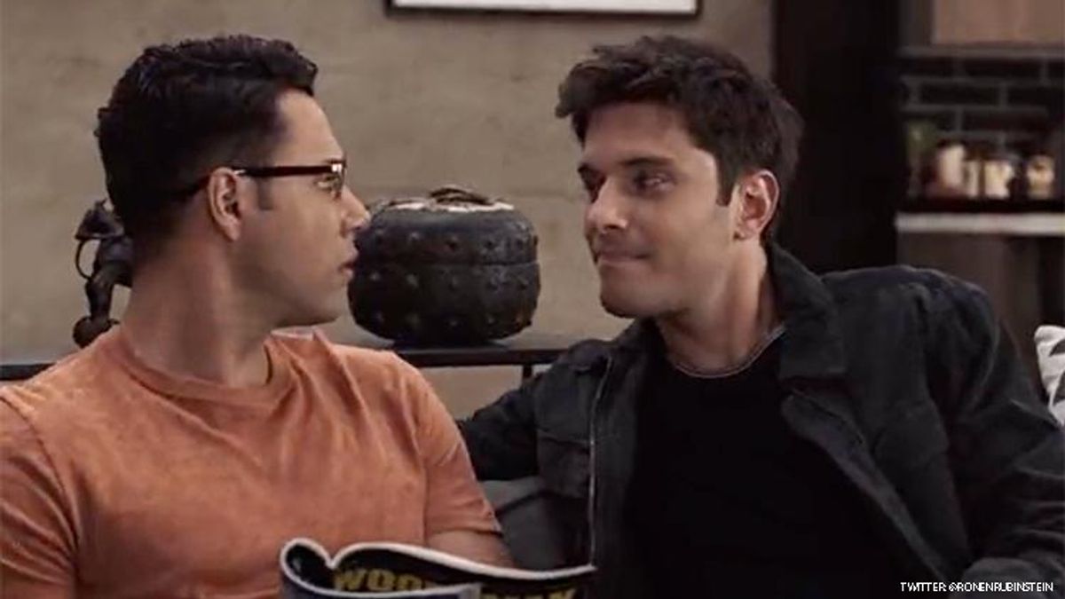 "Hey babe, why don't we do that now?" he asks as he sidles up to Carlos, who had just suggested watching a show together. Then, he gets even closer, whispering "you look so good today" as he goes in for the kiss.