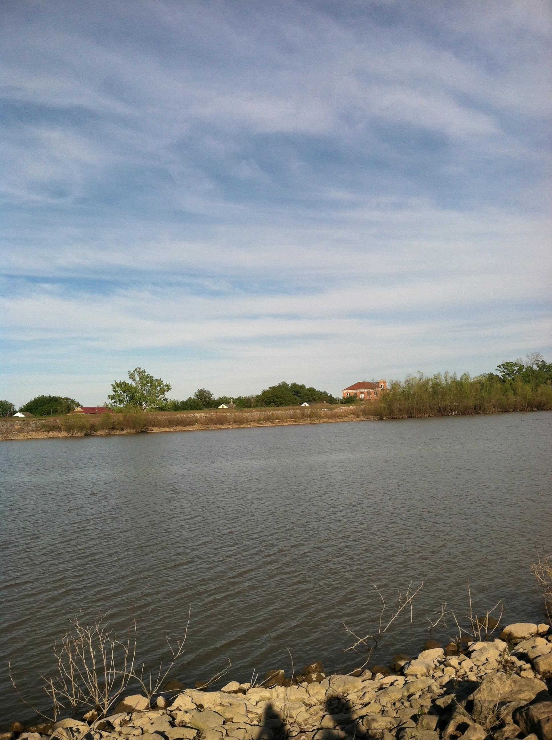 There's little public space on the levee, but it's space enough. A narrow sliver of grass determinedly sprouts and cypress trees line the shore, their gnarled roots maneuvering around a rocky riverbed littered with beer bottles and other refuse. A few yards away, under a disused metal radar tower 5 or 6 men and women sit around, looking like they have nowhere else to be and like they're okay with that. A man jogs by with his dog and a group of men and boys, probably fathers and sons, fish a little ways down the 1500 foot levee, closer to civilization.