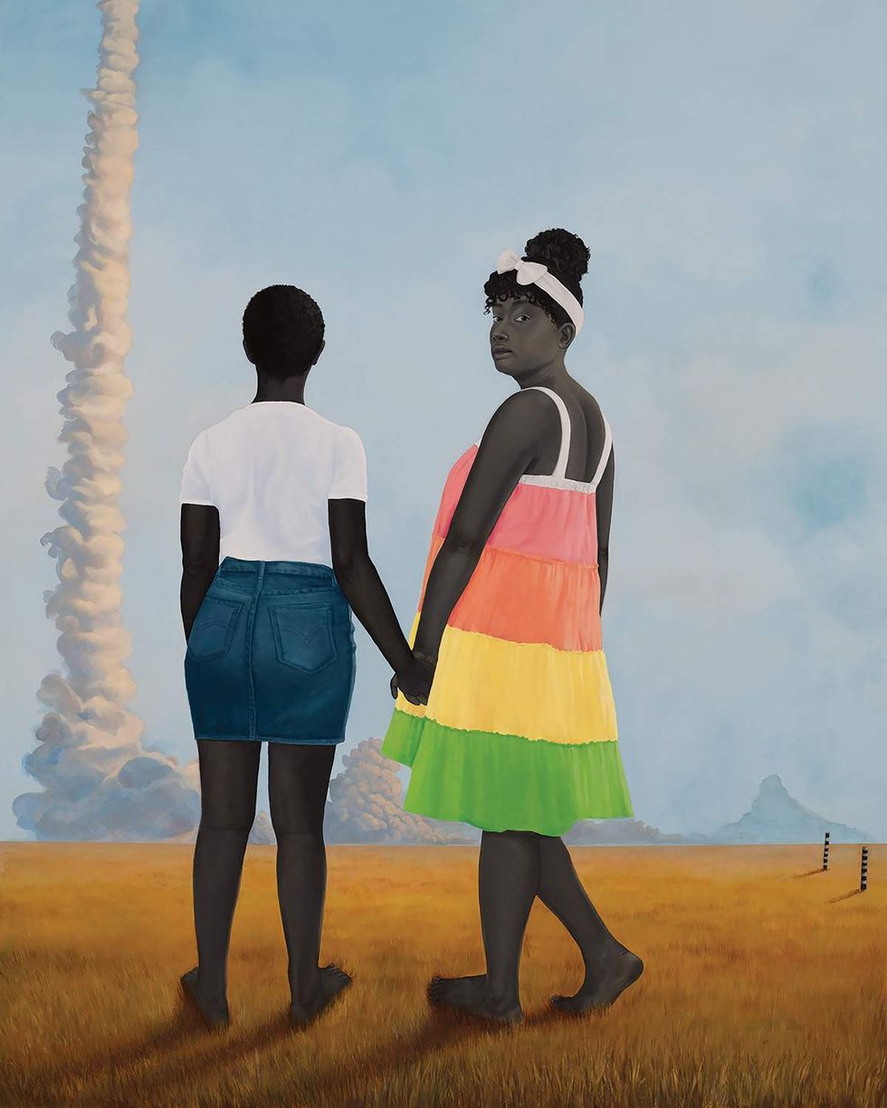 Included in the exhibit is the powerful portrait Trans Forming Liberty. Sherald reinterprets the iconic image of the Statue of Liberty as a Black trans woman gazing beyond the viewer, wearing a blue satin gown while resting her left hand on her hip. Her right hand is raised, holding a torch containing gerbera daisies. The model Arewà Basit, a Black nonbinary trans-femme artist, has reflected on the work: “When I see this, I see all of the years being told that I had to recite the Pledge of Allegiance. And when I found the truest meaning of what that pledge is, I see this version of Lady Liberty.”