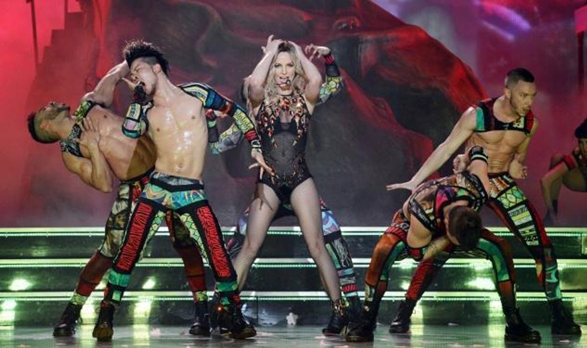 A long list of celebrity spectators were at the Friday performance of the opening night of the "Piece of Me" revue which began its two-year residency at Planet Hollywood in Las Vegas, including Miley Cyrus, Katy Perry, Adam Lambert, Selena Gomez, and Mario Lopez--who, according to The Advocate, Spears dragged up on stage for a playful S&M-themed performance of "Freakshow" in which she spanked her former X-Factor co-star with a riding crop as he crawled across the stage.