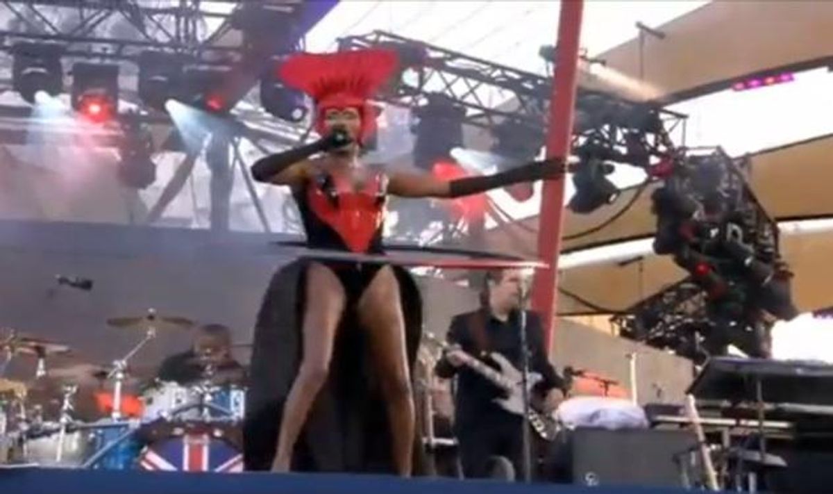 At yesterday's Diamond Jubilee concert held in front of Buckingham Palace, Grace Jones saluted the Queen of England, Elizabeth II. Donning a red-and-black one-piece, a black train with bustle, and an out of this world fishtail headdress, Jones performed her hit "Slave to the Rhythm." While her outfit was over the top, she kept her performance simple but spectacular. The gay icon spun a hula-hoop around her waist for the duration of the nearly four-minute performance. While we're unsure how Her Majesty felt about the performance, it's probably safe to say that every other queen in England was overjoyed.