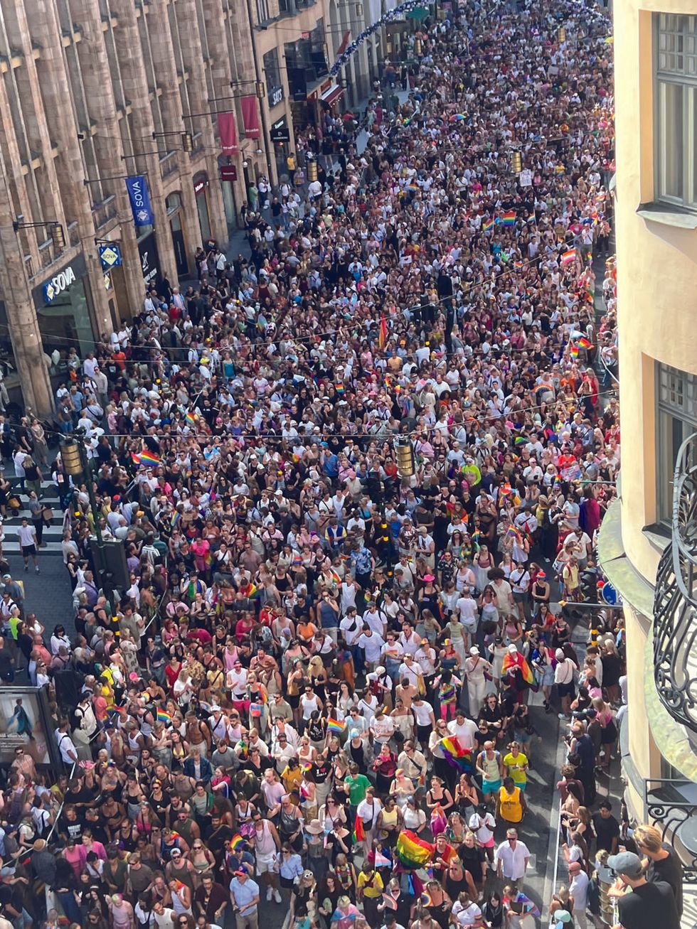 From a bird’s-eye view at Hotel Kung Carl in central Stockholm, we watched the Pride parade. I hooted and hollered and painted my arms with rainbow crayons as trans and rainbow fags rippled in the wind below me. As is common at Stockholm Pride, the parade is immersive, and the crowd often jumps in and marches along. Before long, the street was wall-to-wall with people celebrating queer lives. Our official Pride culminated that evening at Pride Park dancing at the silent disco.
