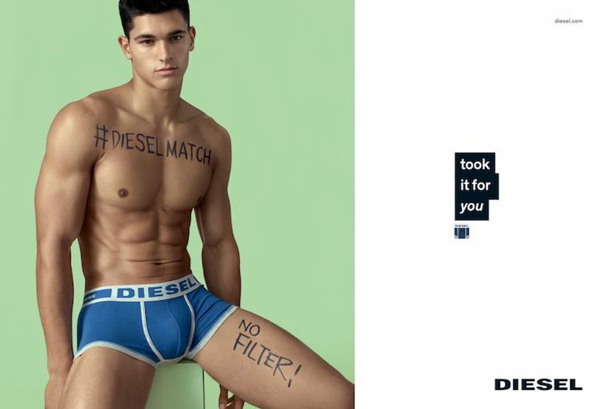Next time you're "browsing" Grindr, Tinder, or Pornhub, you might get a surprise wink model hunk Trevor Signorino. Our last Instaboy of 2015 has teamed up with Diesel's Nicola Formichetti on his latest campaign for the brand. For spring, Formichetti continues to make fun of social media codes, with tongue-in-cheek slogans, custom-made emojis, and airbrushed nipples.