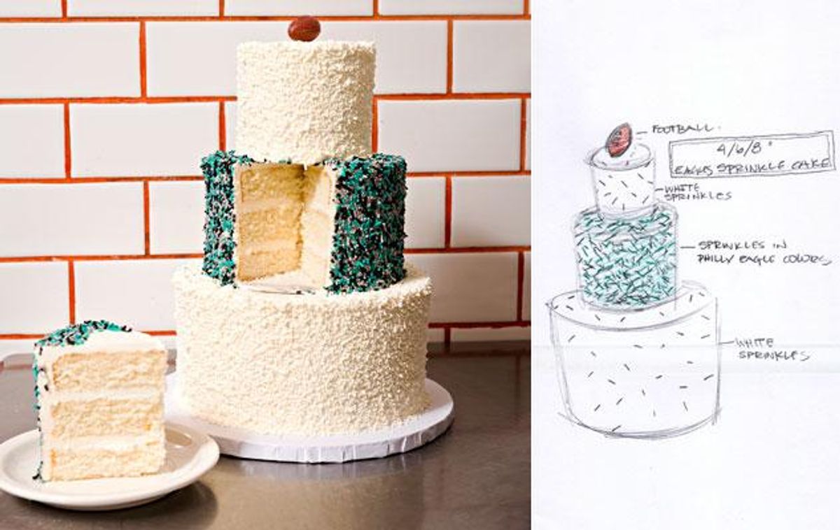 "I am very neutral about cake," confessed Doonan, before adding that Adler was not, and that we should therefore go with his taste. "He loves cakes from a bakery in his hometown of Bridgeton, N.J., named Century Bakery. He loves the juvenile ones, which are decorated like a football field. His team is the Philly Eagles, so any attempt to refer to the Eagles would be greatly appreciated. The cake itself should be vanilla. These Century cakes are unpretentious and unszhooshy and lowbrow."