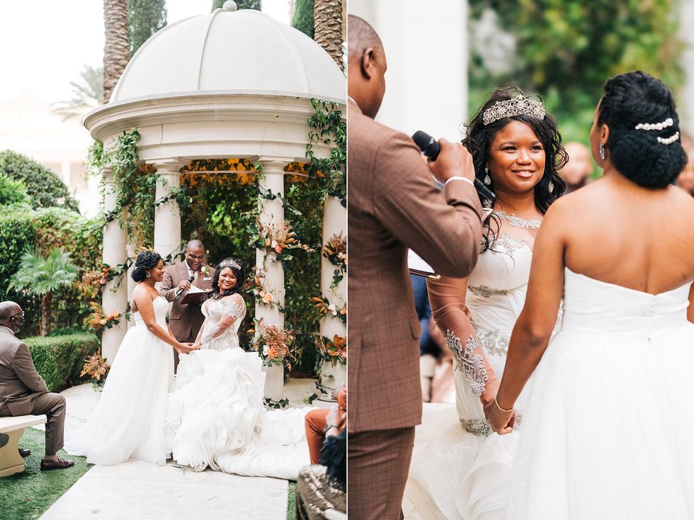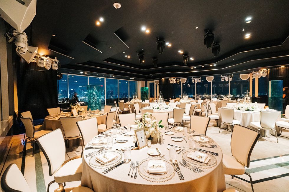After the emotional ceremony—which included a tribute to Stephanie’s late parents—the brides and their guests were shuttled to Ghostbar on the 55th floor of Palms Casino Resort for their reception. They were originally planning to host their reception at Bellagio’s PRIME Steakhouse which has a view of the Fountains of Bellagio, but when they first saw Ghostbar they knew the nightclub atmosphere would be perfect for their guests. The pair loved having all of the club's doors open to take advantage of the breathtaking view of the Las Vegas Strip from the top of the hotel and that there were even speakers outside. "It was such a vibe," Rosalyn says. One of the couple's favorite moments of the night was when the musician they hired started playing K-Ci & JoJo's "All My Life," and all of their guests stopped eating and started singing along.