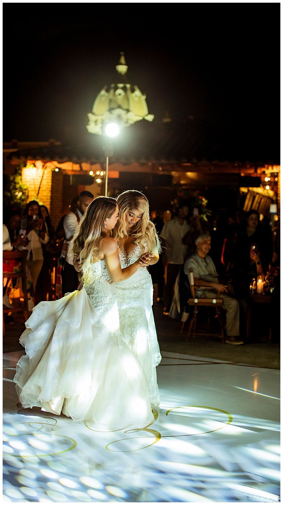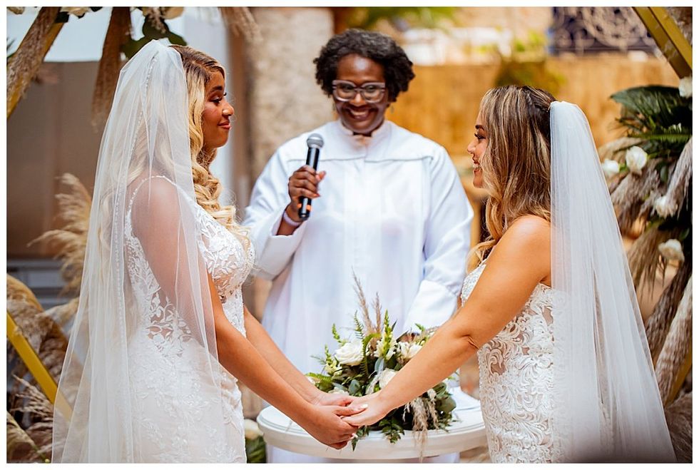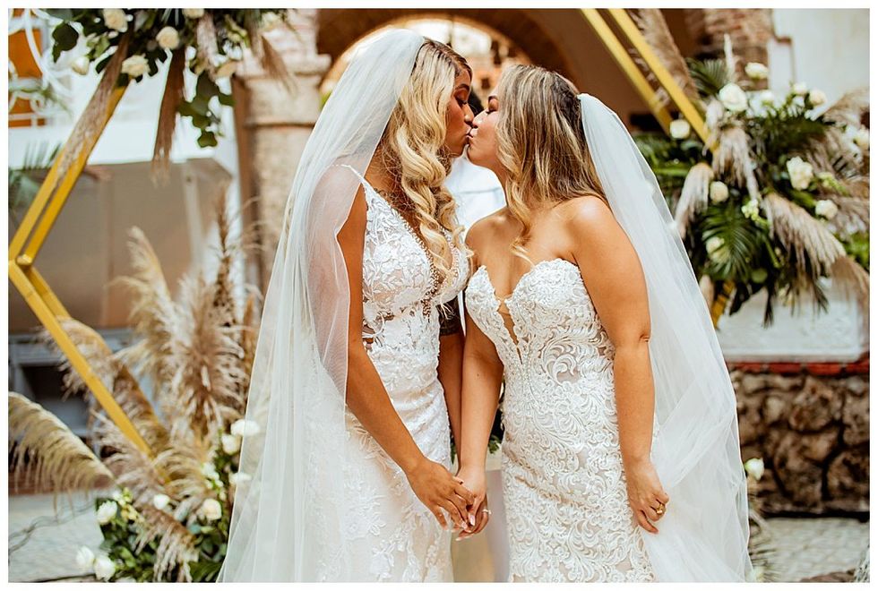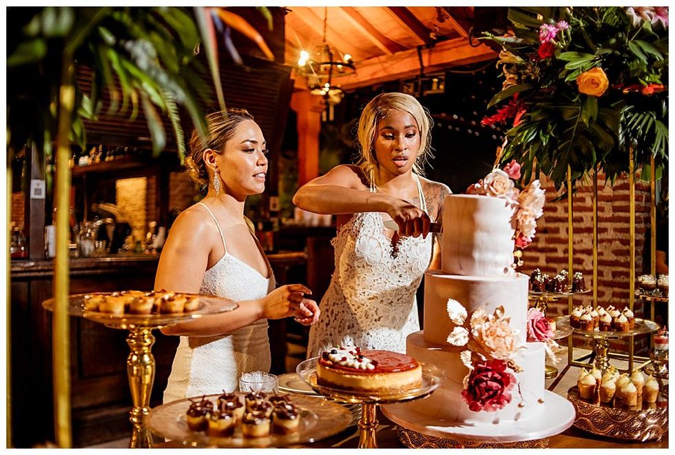 Nicki and Emily’s attire was a highlight of the day. Both brides found their perfect dresses at a Latin-owned shop in Miami, making the experience even more special. They agreed not to see each other’s dresses before the wedding, adding an element of surprise to their day. The floral design was spearheaded by the planning team. “We’re both very hands-off with details like this,” laugh the brides. “We sent our wedding planner floral inspiration from Pinterest. The colors were green and leafy, mixed with white and tropical colors for the reception.” The Two Lovers planning team delivered, and created a lush event design that beautifully integrated with the already gorgeous venue.