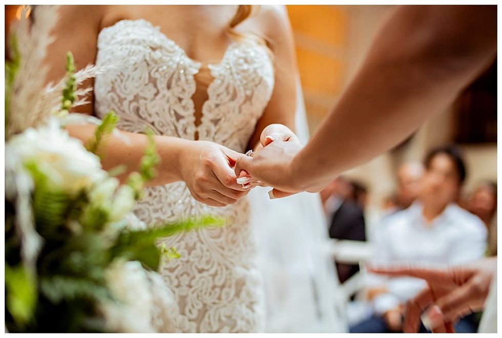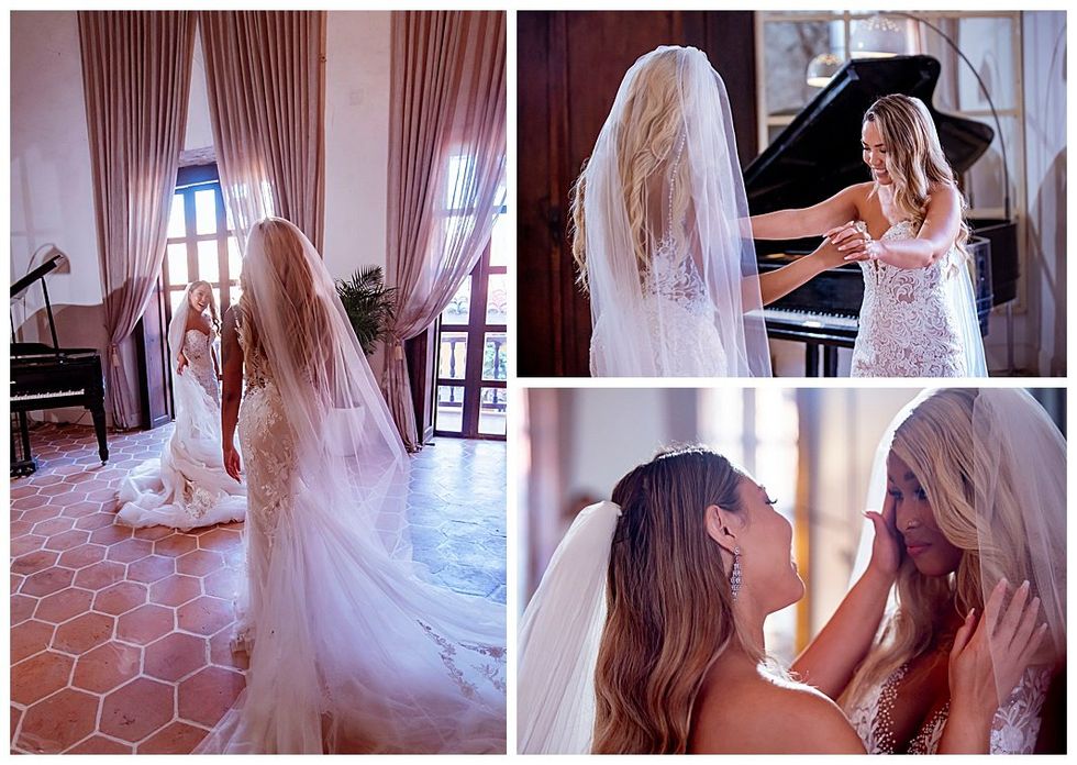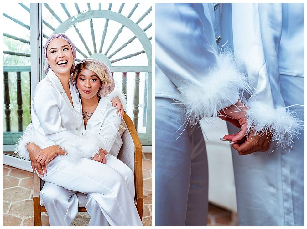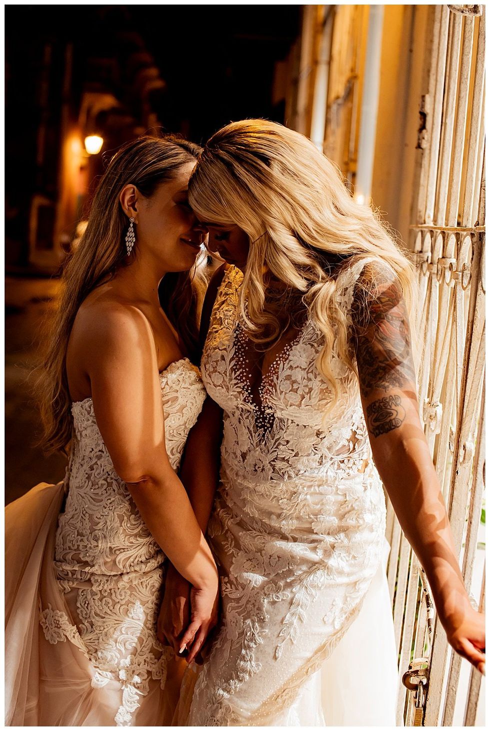 Nicki and Emily’s attire was a highlight of the day. Both brides found their perfect dresses at a Latin-owned shop in Miami, making the experience even more special. They agreed not to see each other’s dresses before the wedding, adding an element of surprise to their day. The floral design was spearheaded by the planning team. “We’re both very hands-off with details like this,” laugh the brides. “We sent our wedding planner floral inspiration from Pinterest. The colors were green and leafy, mixed with white and tropical colors for the reception.” The Two Lovers planning team delivered, and created a lush event design that beautifully integrated with the already gorgeous venue.