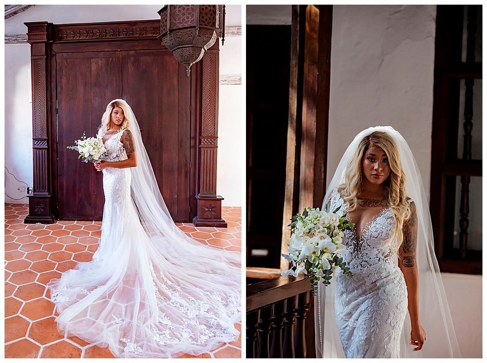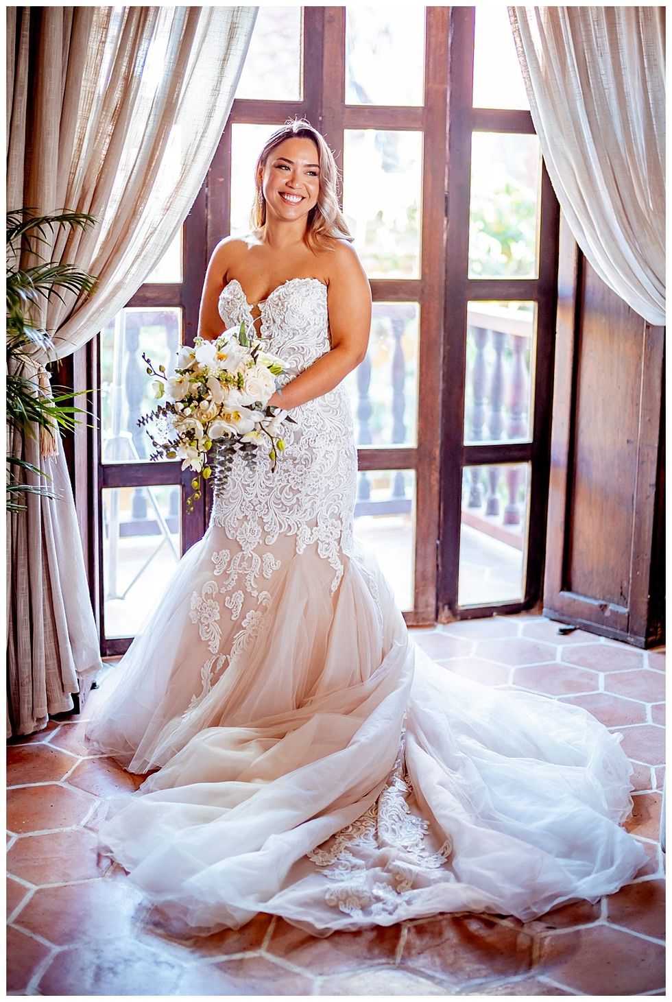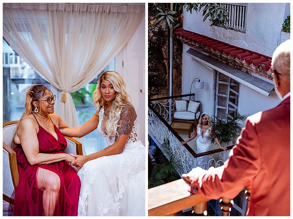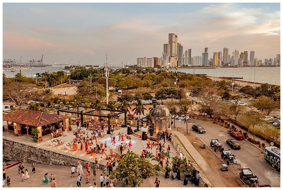 Choosing Cartagena as their wedding destination was a sentimental decision, as Emily has Japanese and Colombian heritage. The couple fell in love with the stunning architecture and magical ambiance of El Marqués Boutique Hotel, which also provided accommodations for their guests. The reception at Baluarte de San Francisco Javier, with its breathtaking views of the city and shoreline, especially at sunset, was a dream come true. “Another reason we decided on Cartagena is because of their beautiful traditions. We had dancers dressed in cultural wedding attire, and had a parade from Marqués to the wedding reception,” adds the couple.