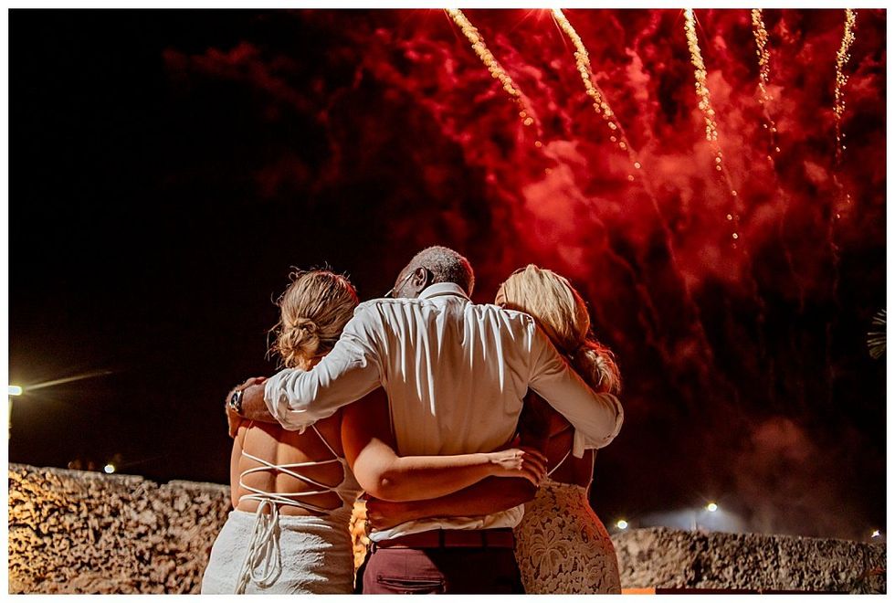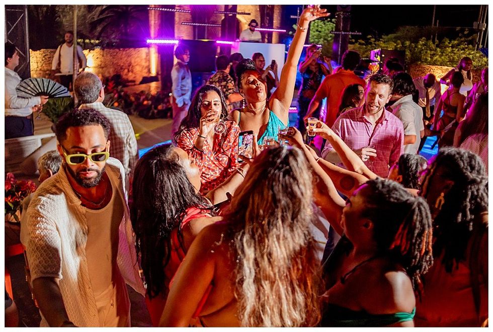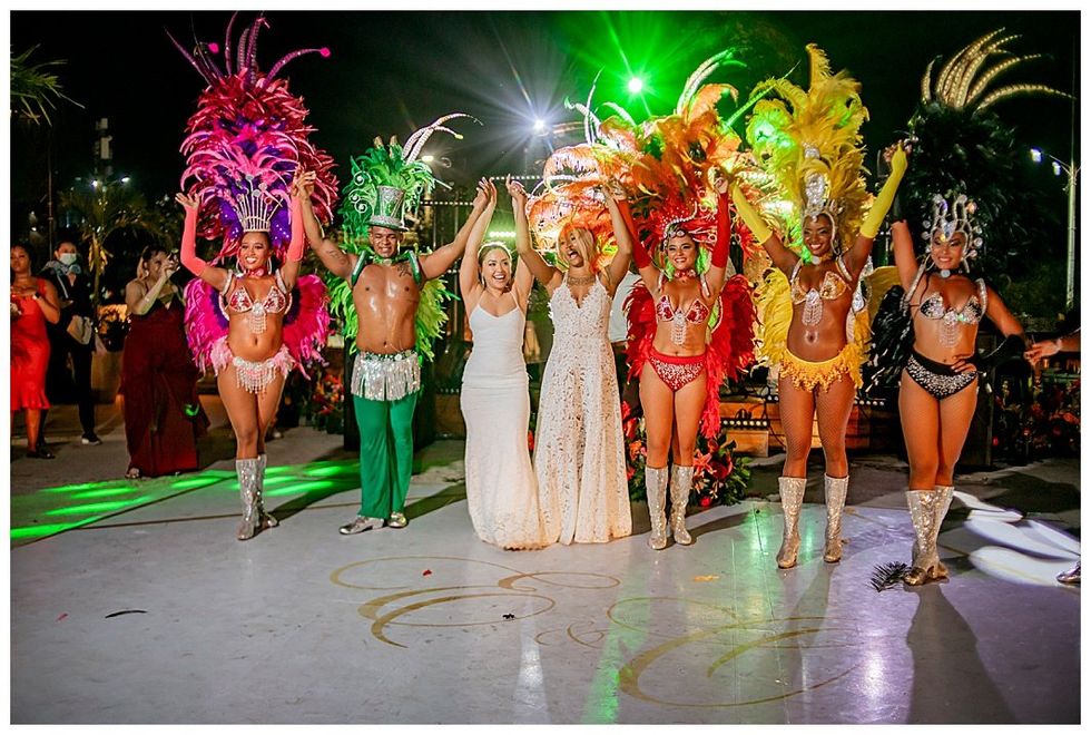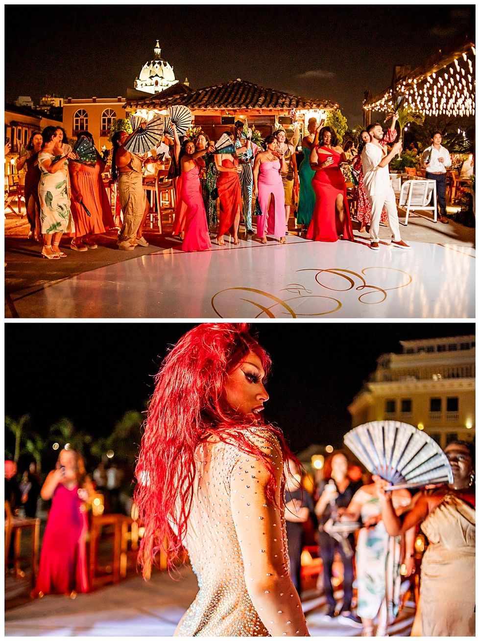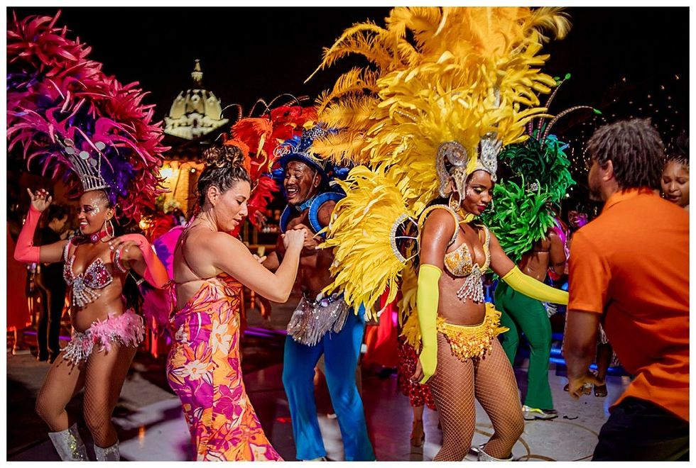 Entertainment was a key component of the celebration. Guests were treated to a pre-wedding beach club day and party buses, setting the tone for a fun-filled weekend. A live band featuring cellos, violins, and saxophones provided beautiful music during the ceremony. Traditional Cartagenian dancers and musicians led a parade from the ceremony to the reception, adding a festive touch. The reception featured a 360 photo booth, a Colombian drag queen performance, and a lively “Crazy Hour” with dancers in extravagant costumes (a Colombian wedding tradition), culminating in a fireworks display.