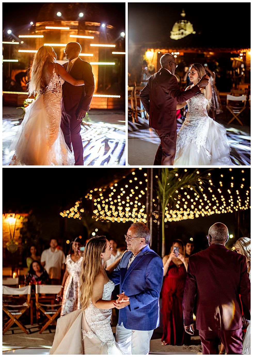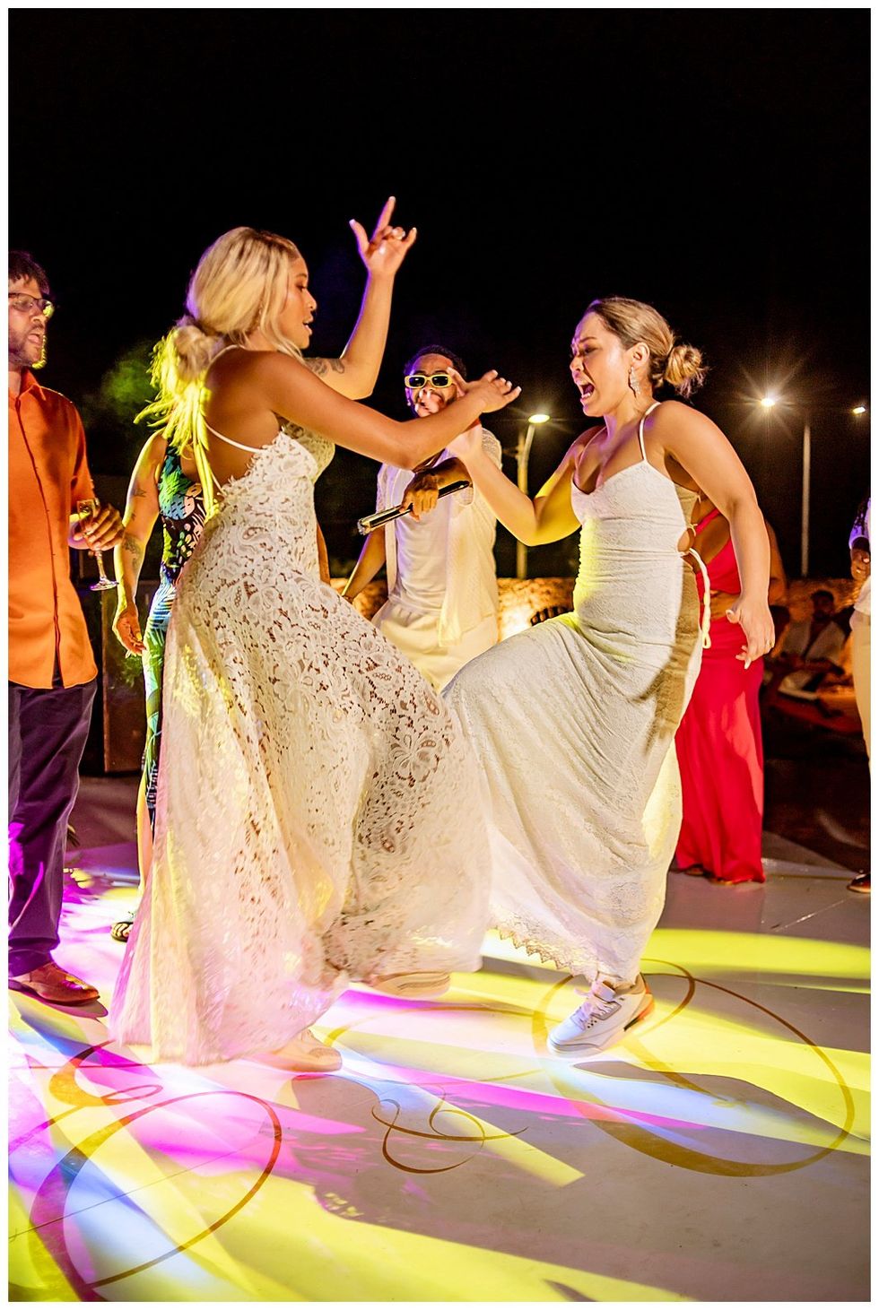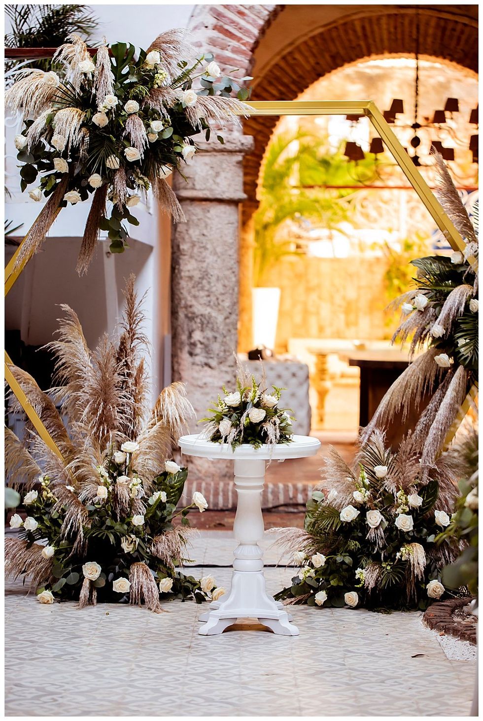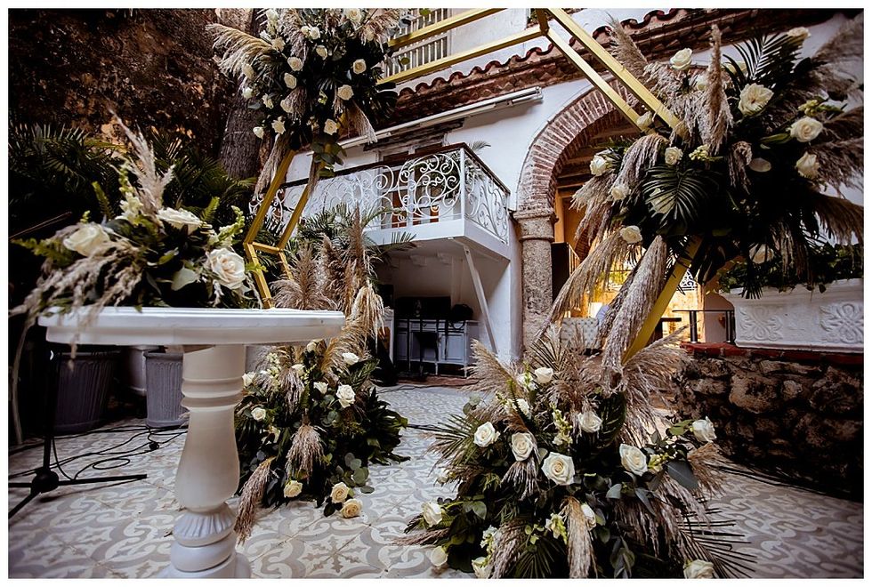 Entertainment was a key component of the celebration. Guests were treated to a pre-wedding beach club day and party buses, setting the tone for a fun-filled weekend. A live band featuring cellos, violins, and saxophones provided beautiful music during the ceremony. Traditional Cartagenian dancers and musicians led a parade from the ceremony to the reception, adding a festive touch. The reception featured a 360 photo booth, a Colombian drag queen performance, and a lively “Crazy Hour” with dancers in extravagant costumes (a Colombian wedding tradition), culminating in a fireworks display.