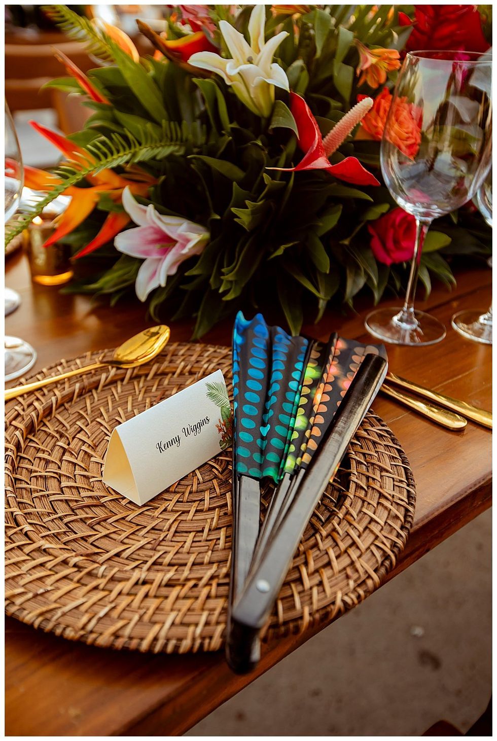 The reception decor continued the tropical theme with colorful plant and flower arrangements on each table. Large green plants were strategically placed to separate different areas, while string lights added a romantic glow. The dance floor, a porcelain white with the couple’s initials in large gold lettering, became the foundation for dancing late into the night.