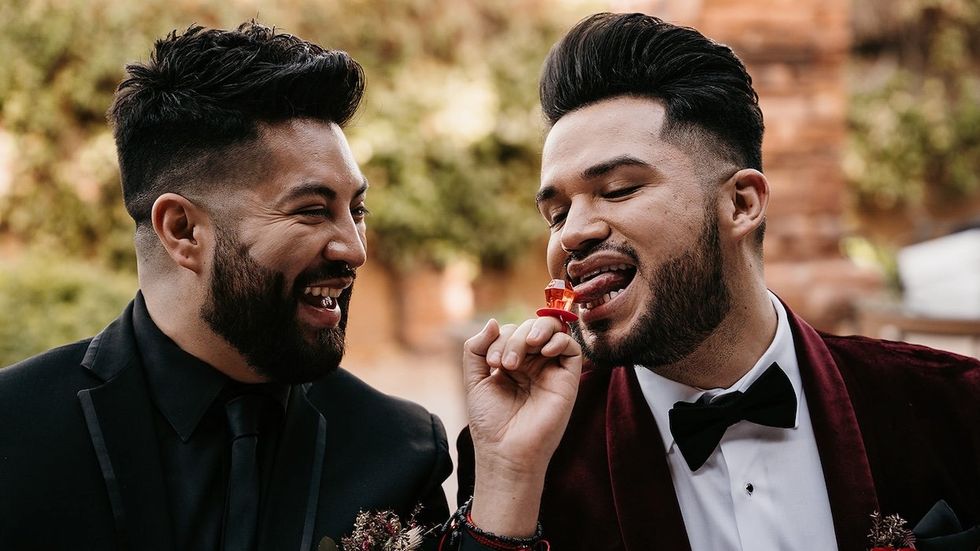 The red florals, modern hearts and heart-shaped hors d'oeuvres may perfect for the 14th of February, they're a fit for any time of the year to celebrate L-O-V-E. And I don't know about you, but I am all about cracking into a dessert just as these grooms did (new trend alert?).