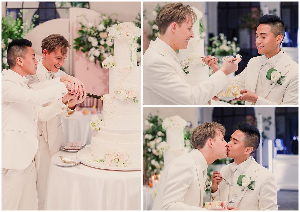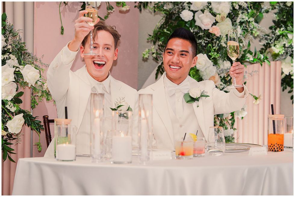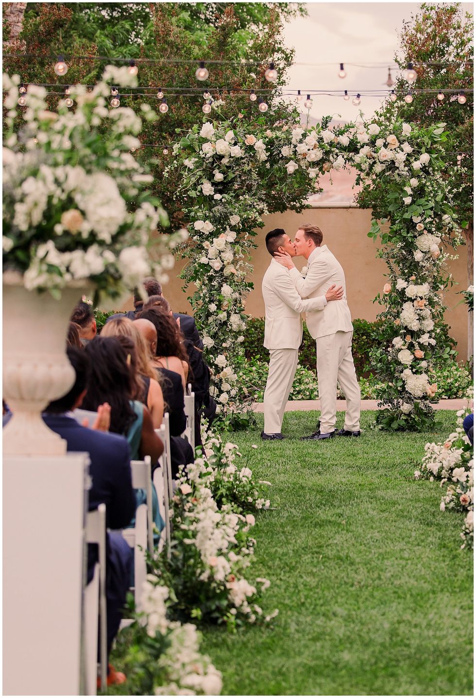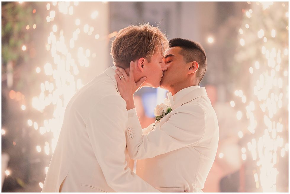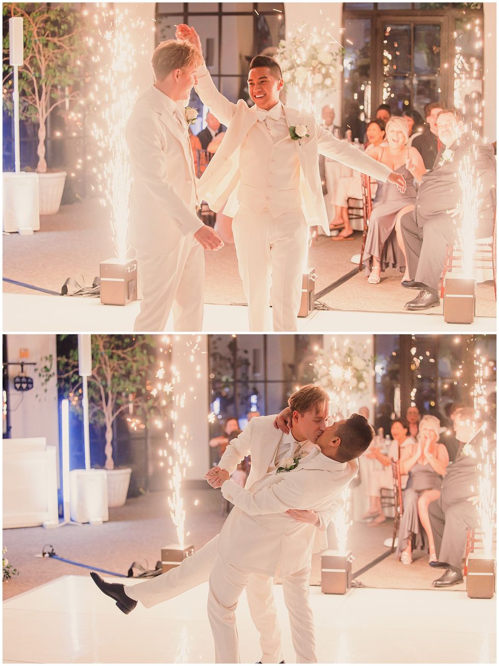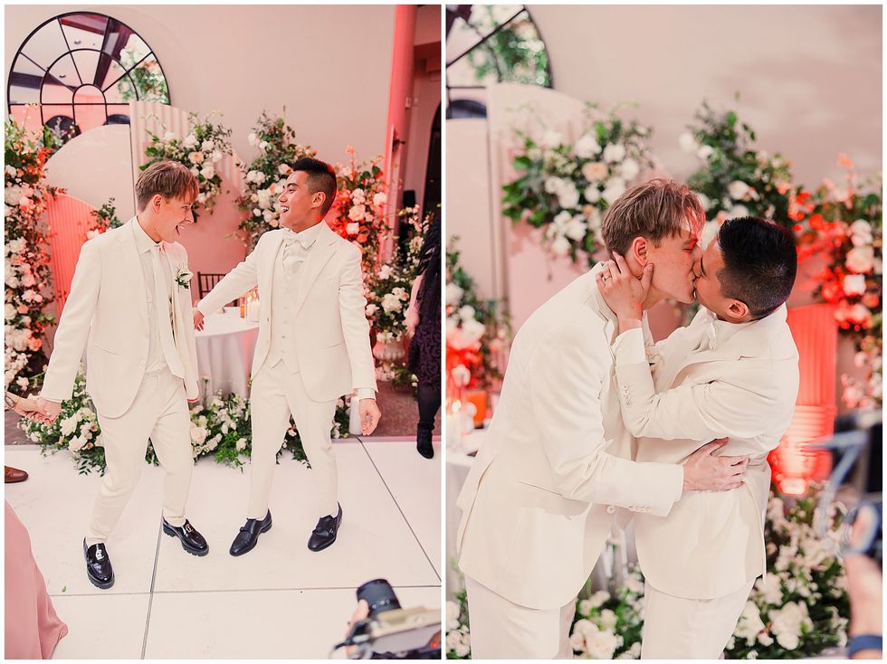After a private vow exchange, the grooms — dressed in handsome matching white Suit Supply suits — exchanged formalities underneath a breathtaking white flower-filled arch. The abundant florals continued into the reception space where floral-filled urns graced tables. Antonio’s aunt, a pastry chef, crafted a delicate, floral-inspired cake.