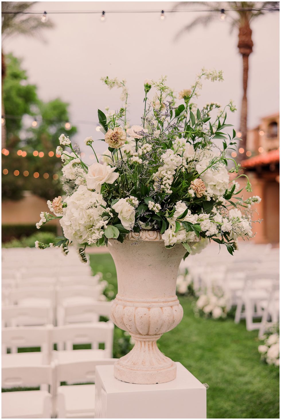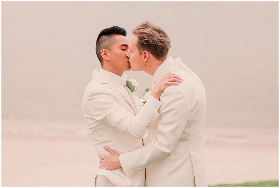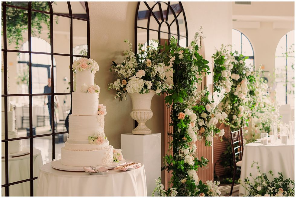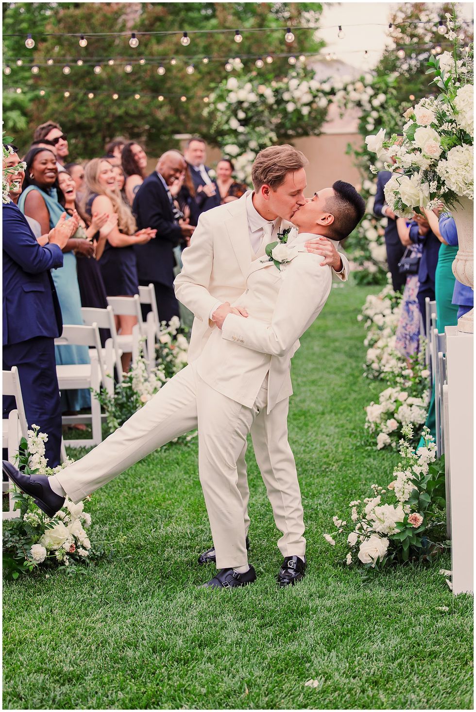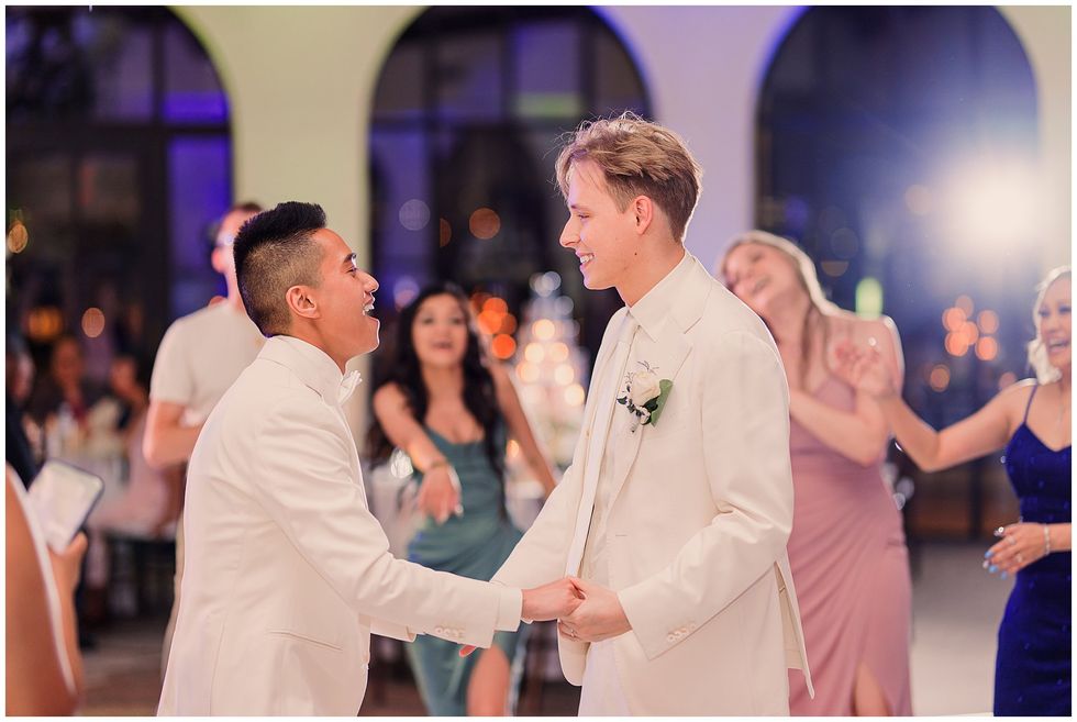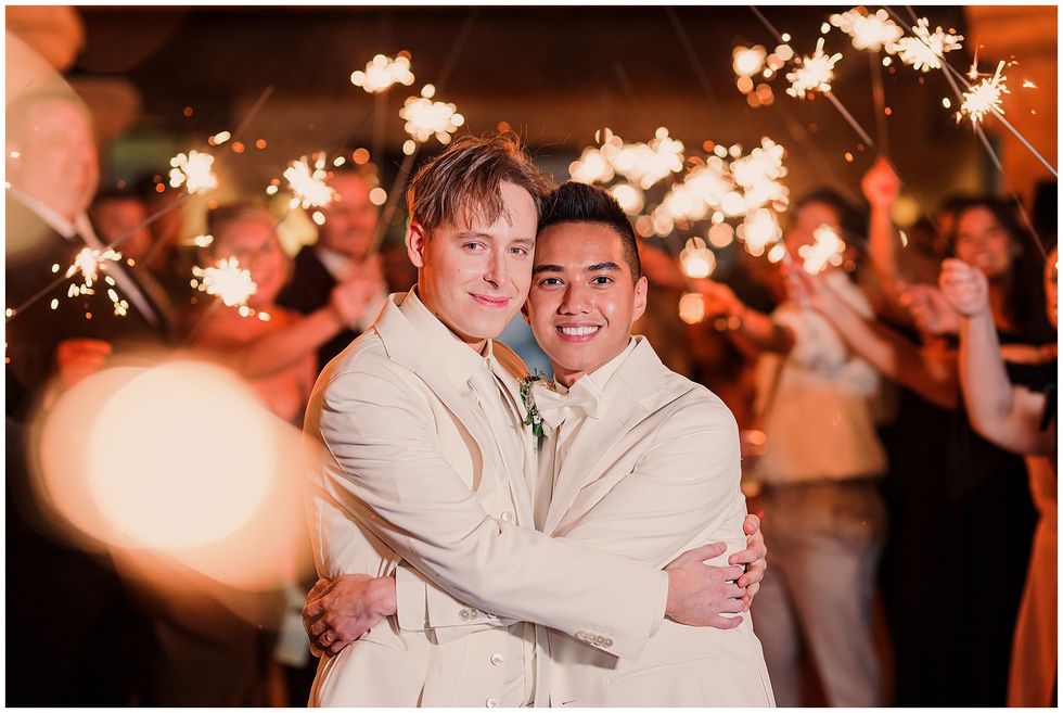 After a private vow exchange, the grooms — dressed in handsome matching white Suit Supply suits — exchanged formalities underneath a breathtaking white flower-filled arch. The abundant florals continued into the reception space where floral-filled urns graced tables. Antonio’s aunt, a pastry chef, crafted a delicate, floral-inspired cake.