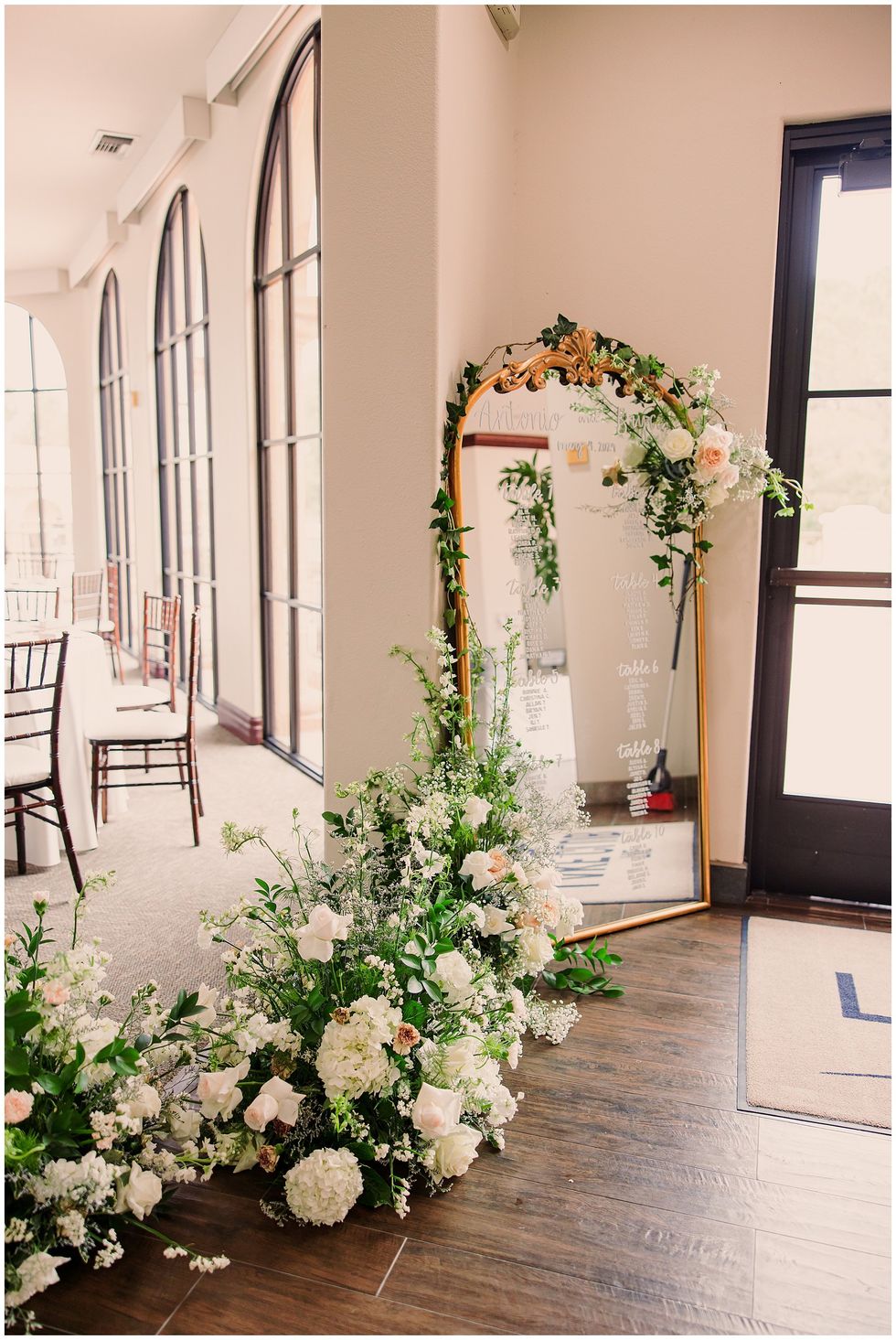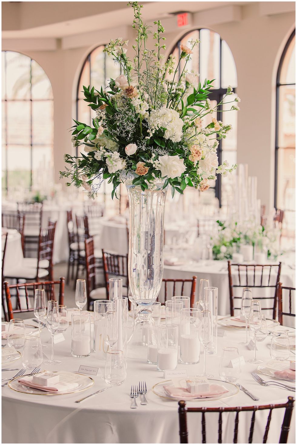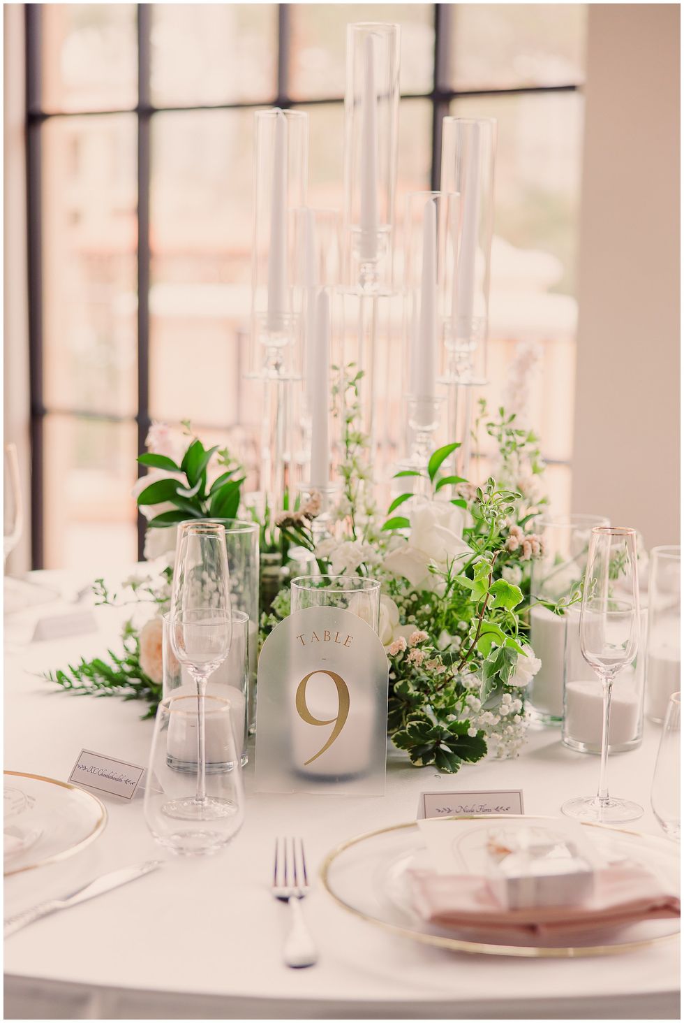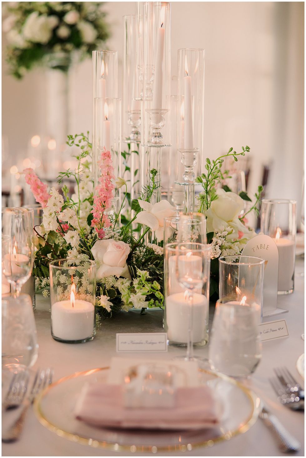 The couple chose the lakeside venue for its architectural charm, “Specifically the arched windows,” says the couple. “We went for a very classic, romantic vibe, and there's no better way to achieve this than with an abundance of florals and candles.”